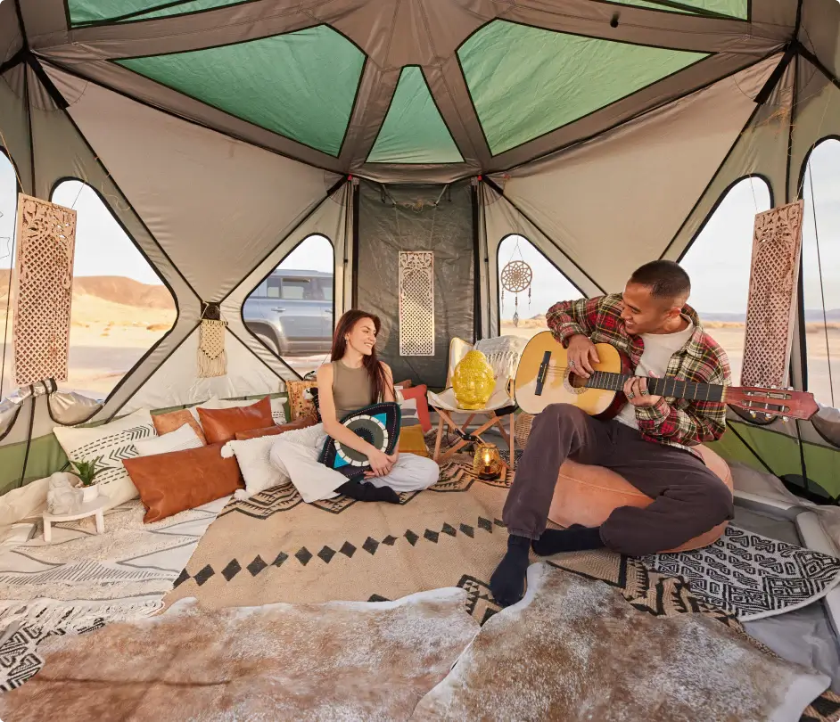 Space Acacia is made from lightweight yet weatherproof and durable Oxford 300D fabric that can withstand rain water pressure of 2000mm, wind resistant up to 45mph, and flame resistant (CPAI-84 compliant Fire Protection). It boasts a 6-inch thick waterproof AirFloor system designed to withstand any surface, from rough to rocky terrain and even water.