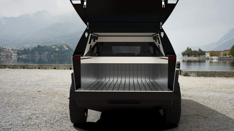 Moreover, it boosts durability and is visually seamless with the standard finish of the electric pickup truck. Universal L-track runners on the roof allow you to pair the Space Camper with a bunch of accessories. Pneumatic cylinders make it easy to lift, which also reveals a Murphy-style bed with detachable hinges.