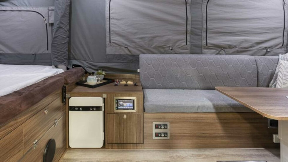 As for power, this off-grid camper runs on dual 100-Ah batteries working together with a 1,000-W inverter and 30-A charger. Solar power is possible but optional. Best of all is the setup which is mostly automated using a control panel with assigned switches. These include stabilizing the legs, inflating the camper and the awning, opening the front and back lids, and more.