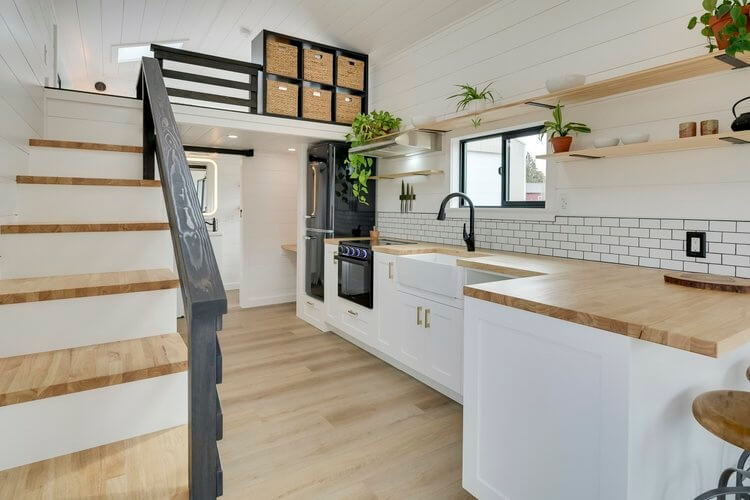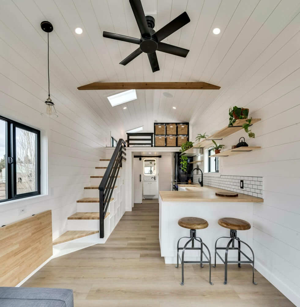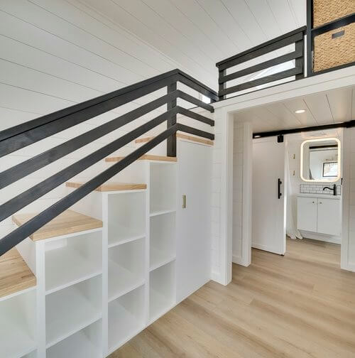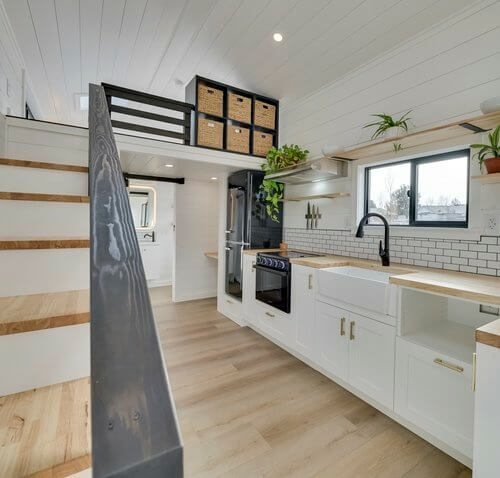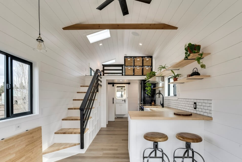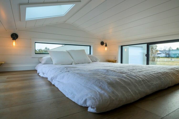 The Ochoco tiny house only has one loft bedroom accesssible via a storage-integrated staircase. The bedroom has two skylights and glass windows around. It’s limited in space and only allows a mattress instead of a bed on the floor. The house feels airy and large thanks to its black and white color theme.