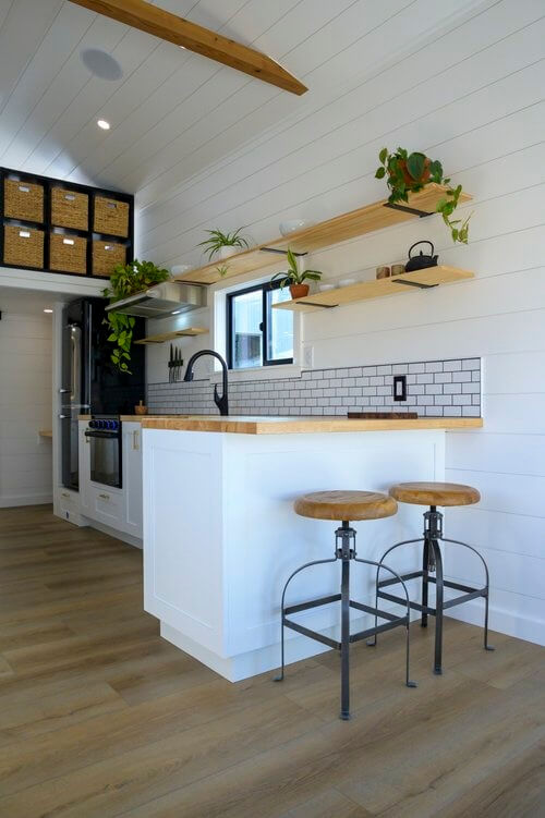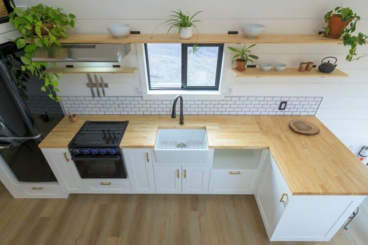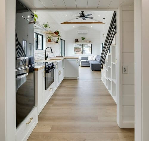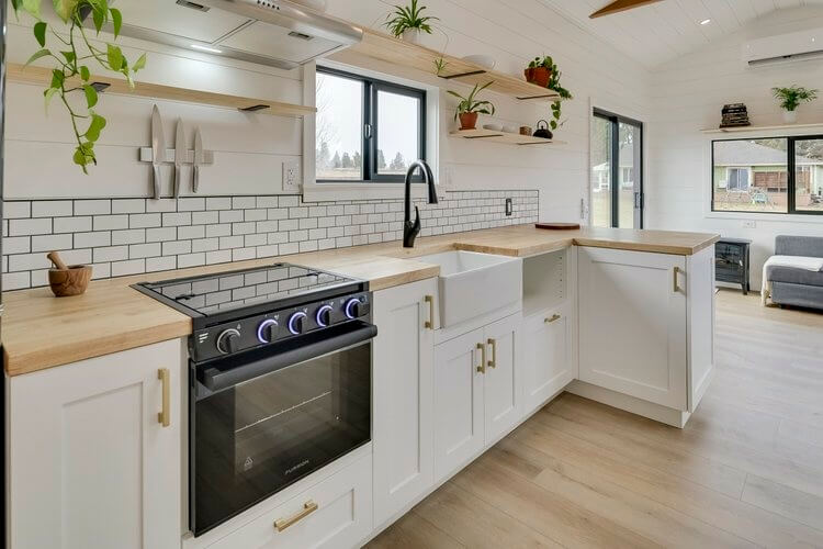 The living area in the Ochoco tiny house can fit a full-size L-couch or a sofa bed for added bed space. Then on the center is an elegant and well-equipped kitchen with built-in cabinetry, overhead shelving, and cupboards for storage. It has modern appliances including a 3-burner gas range oven and hood, refrigerator, and space for a microwave.