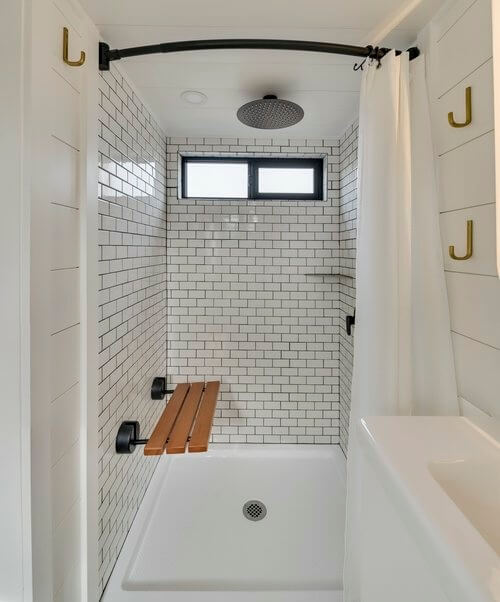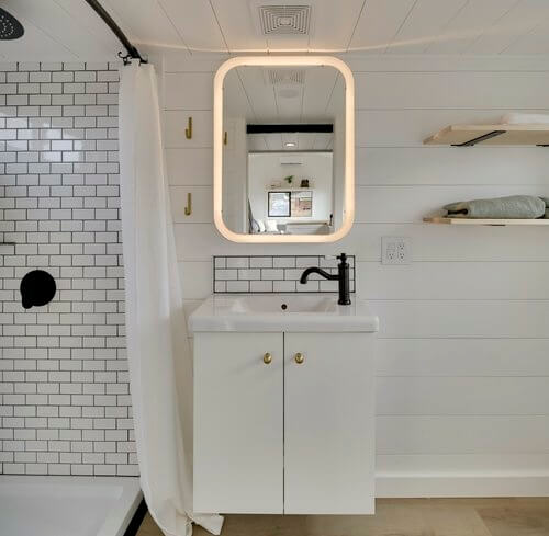 There’s also an L-shaped breakfast bar and a collapsible table by the living room for work or dining. Meanwhile, on the far end of the house is the bathroom accessible via a barnstyle door. It features premium finishes with subway tiled shower and practical touches including a floating vanity, mirrored medicine cabinet, and Incinerating toilet.