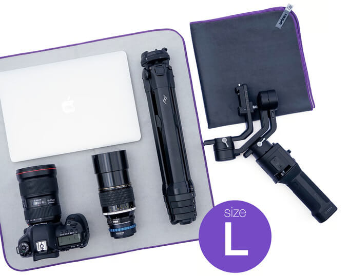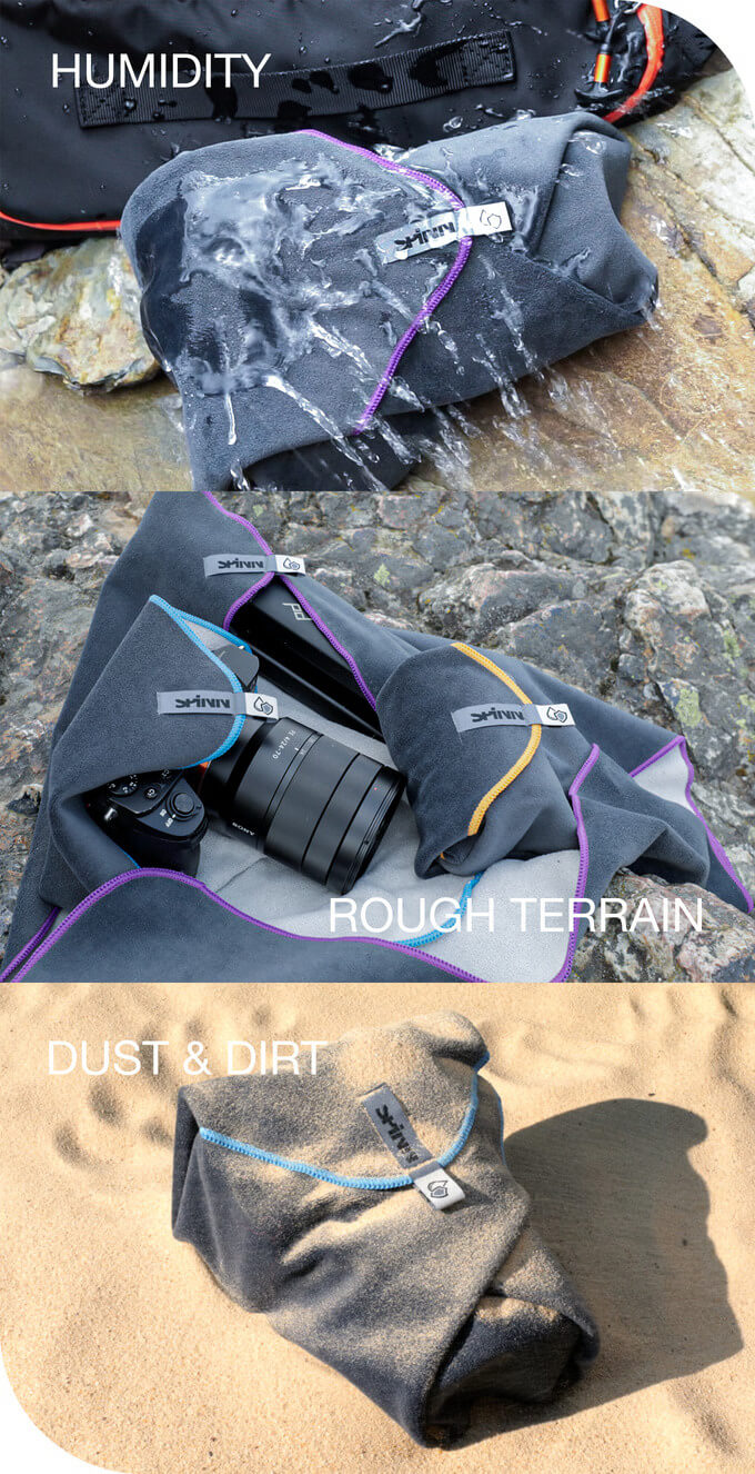 ProWrapp features a high-pile fabric with an exceptionally soft feel and superb shock absorption. Its interior is soft enough to wipe dust or dirt off from lenses without scratching them. Its waterproof barrier ensures items stay dry and protected from water splashes, dust, sand, and the unexpected downpour.