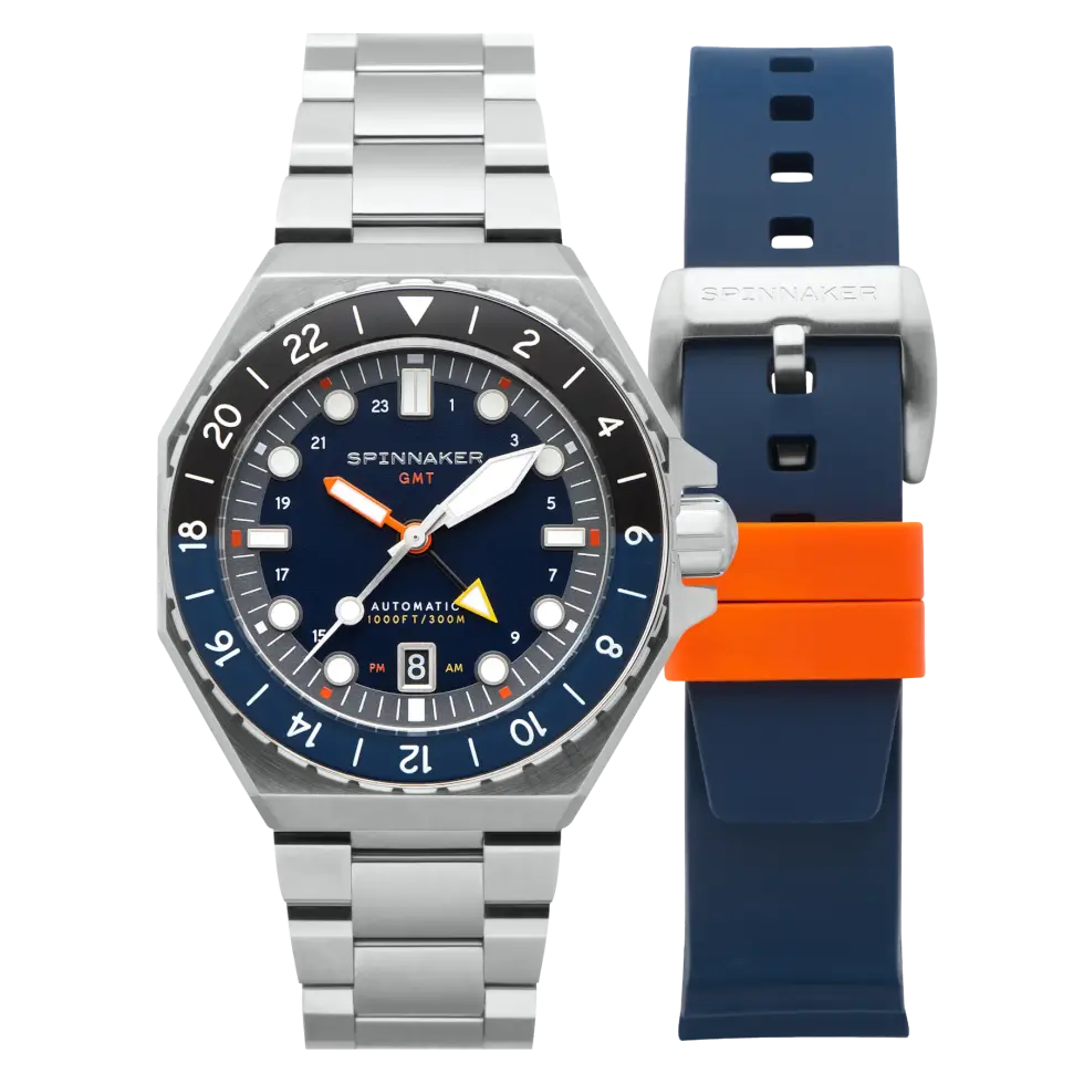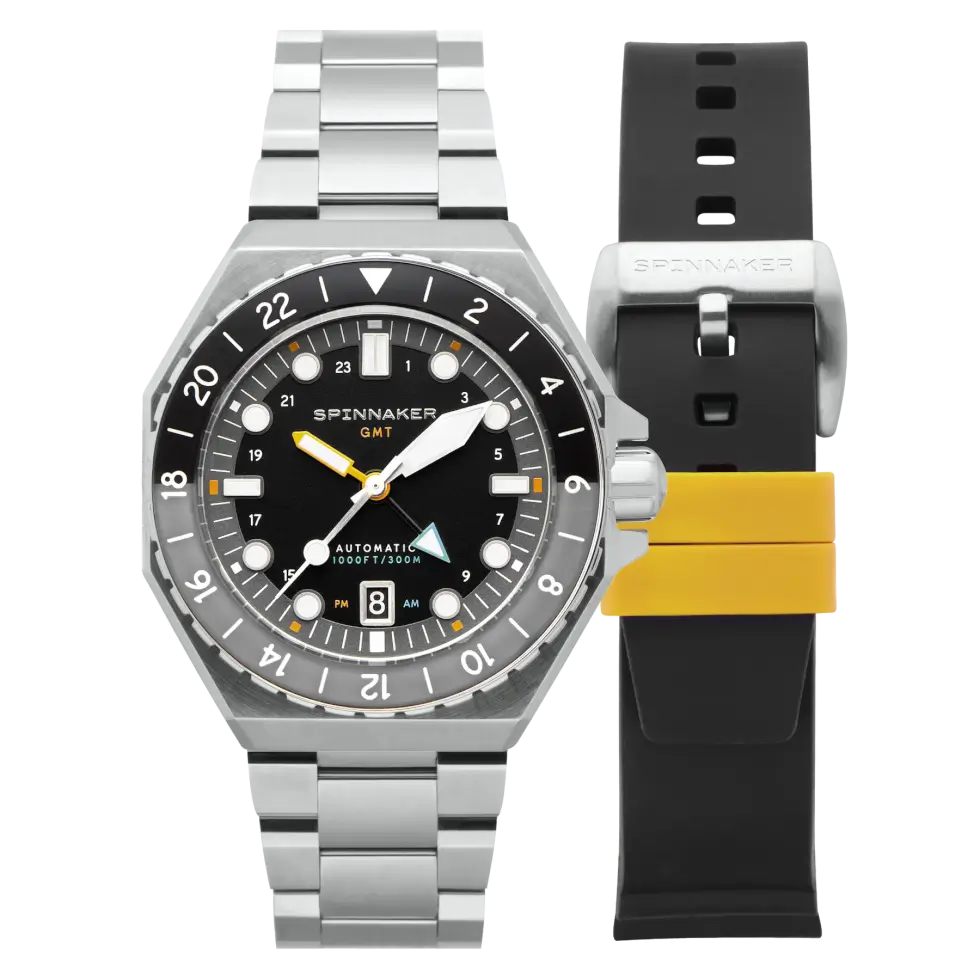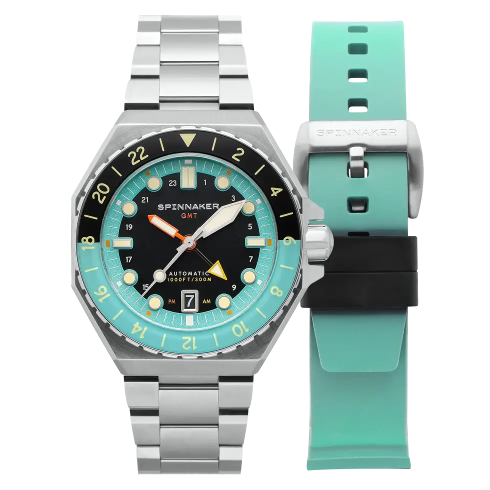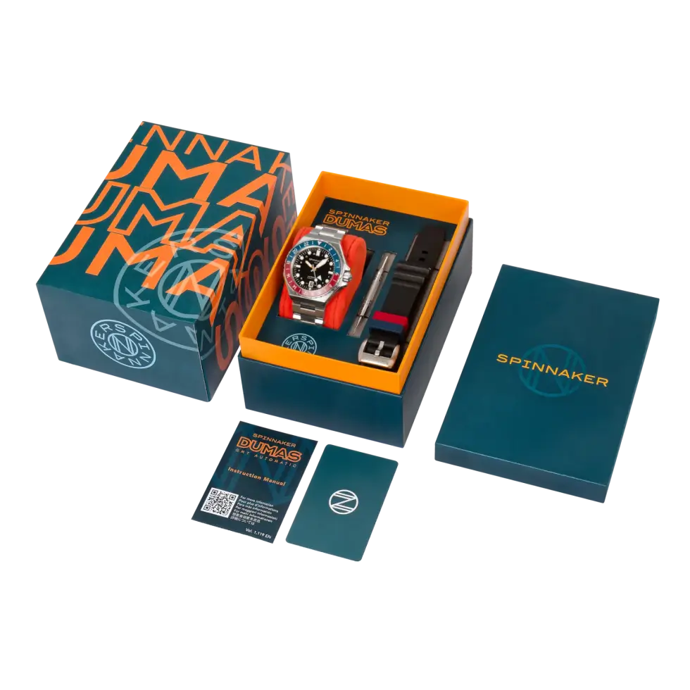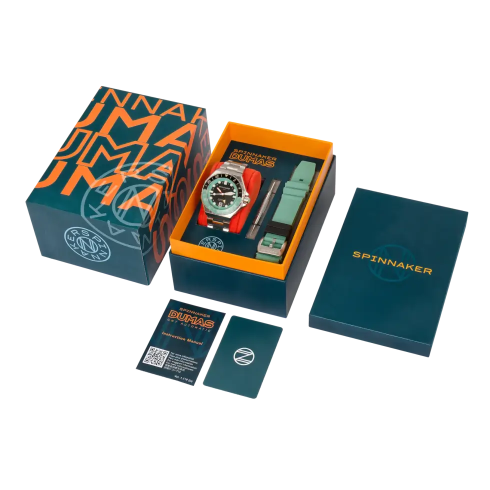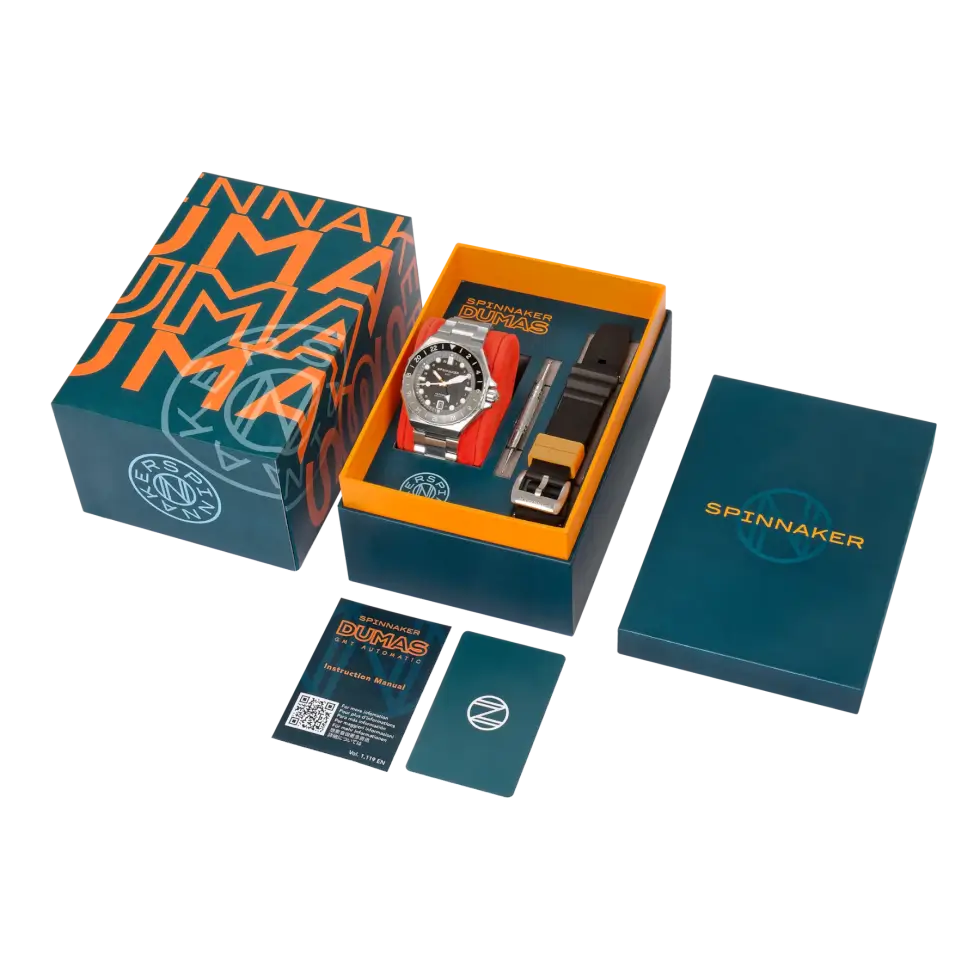 At the core of this fantastic timekeeping instrument is a Seiko NH34 GMT self-winding caliber. Users can view the inner workings of the automatic movement via the open-work case back. Spinnaker typically advertises the Dumas GMT Automatic with a stainless-steel bracelet, but it also ships with a rubber strap for owners to mix and match.