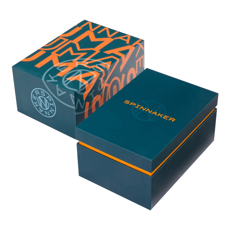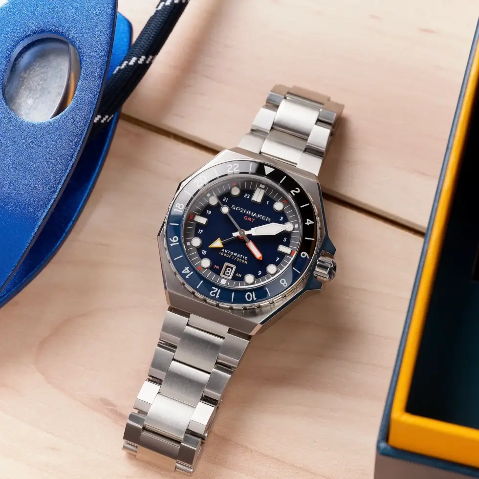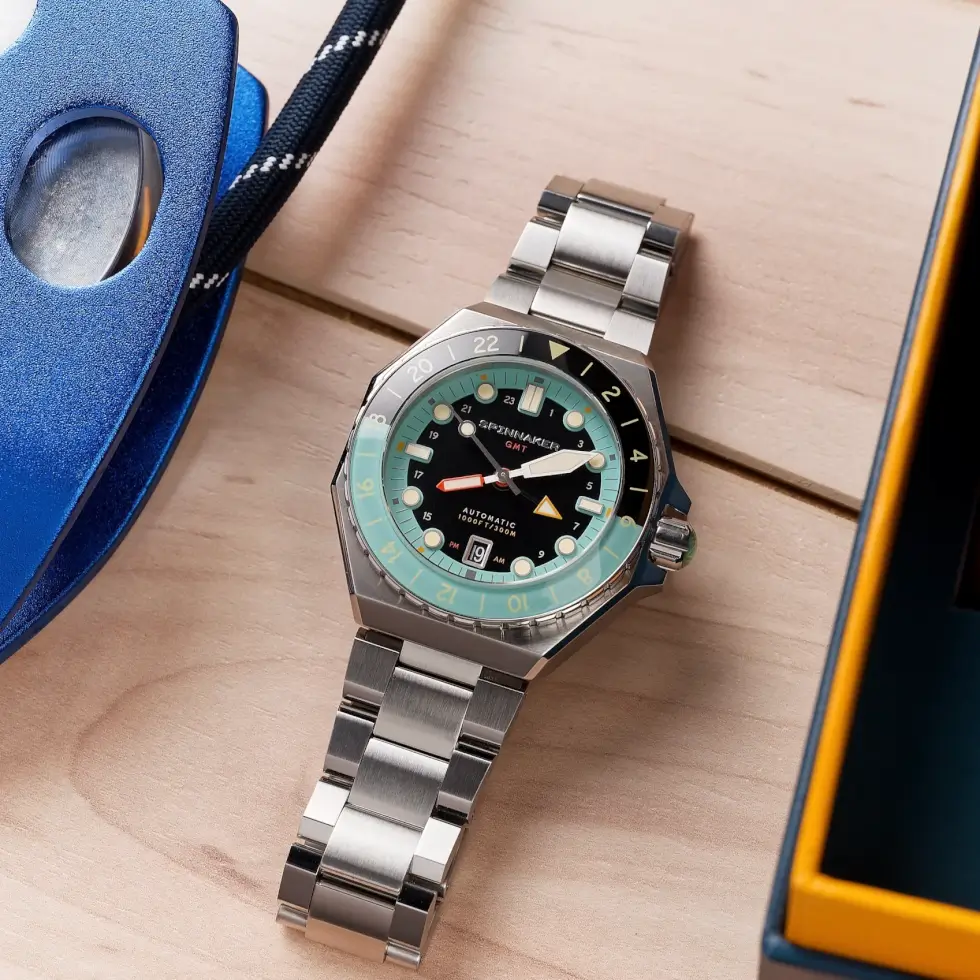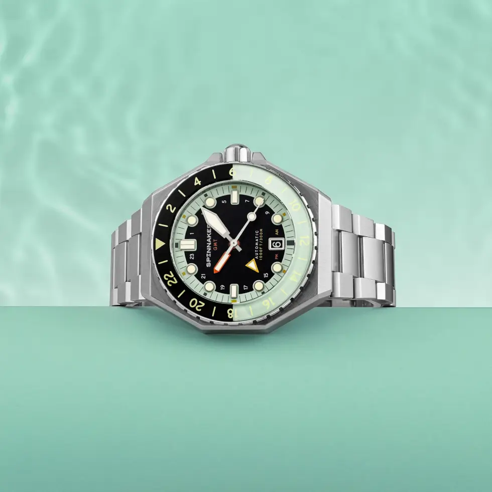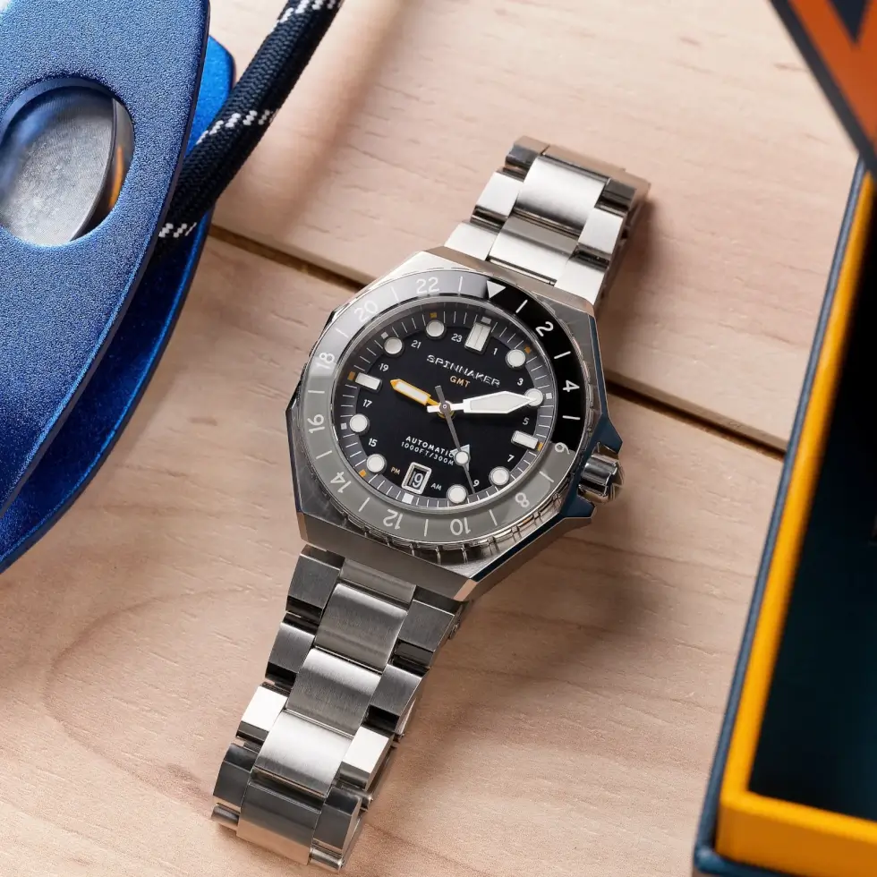 The product page describes it as “A bold study in high-quality sport watch mechanics injected with the style and flair synonymous with the Spinnaker name.” Although the rotating bi-directional bezel might make it seem like a round form factor, the 44 mm x 15 mm stainless-steel case sports a hexagonal outline instead.