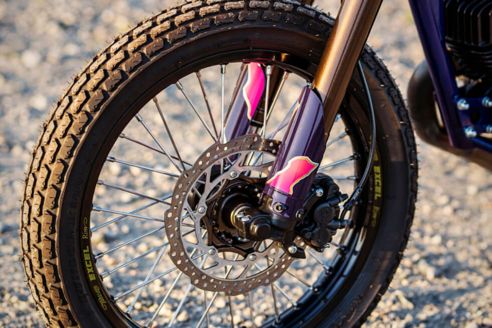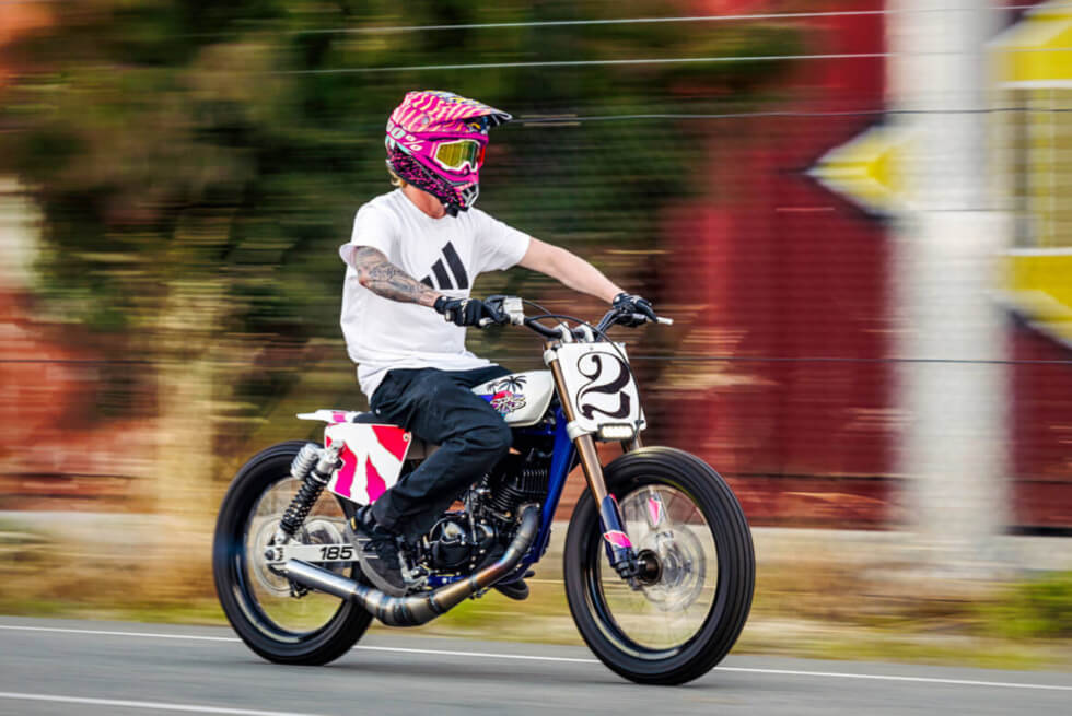 Once more, he is taking components such as the pivot tube and bearings from a Yamaha YZF-R15 with YZ250 axle blocks. What follows is a pair of rear shocks courtesy of a Kawasaki Zephyr 750. What was a classic now rides on 19” Excel wheels shod in Dunlop K180 flat-track tires. So, there you have it. Even a simple aftermarket job like this Suzuki TS185 can produce something with unique DNA.
