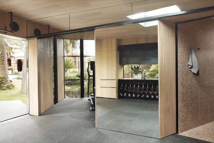 Assembled on Gaddigal land, the Stealth Pavilion sits among trees which made it a challenge for architect Robert Plumb Build. He had to build the home gym strategically with the trees in mind. These include suspending the slab above the ground so concrete piles hold most of the load of the pavilion walls instead of the ground. This process helped prevent damage to the trees and their root system. It also allowed nature to disguise the structure.
