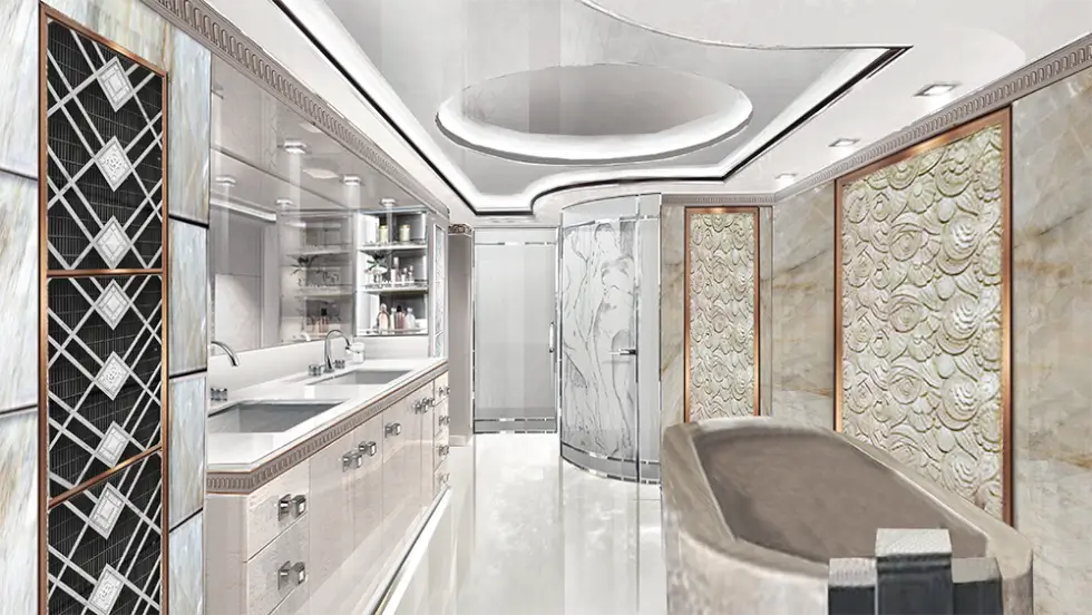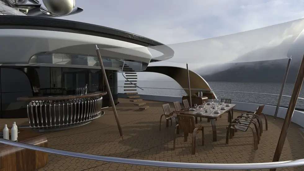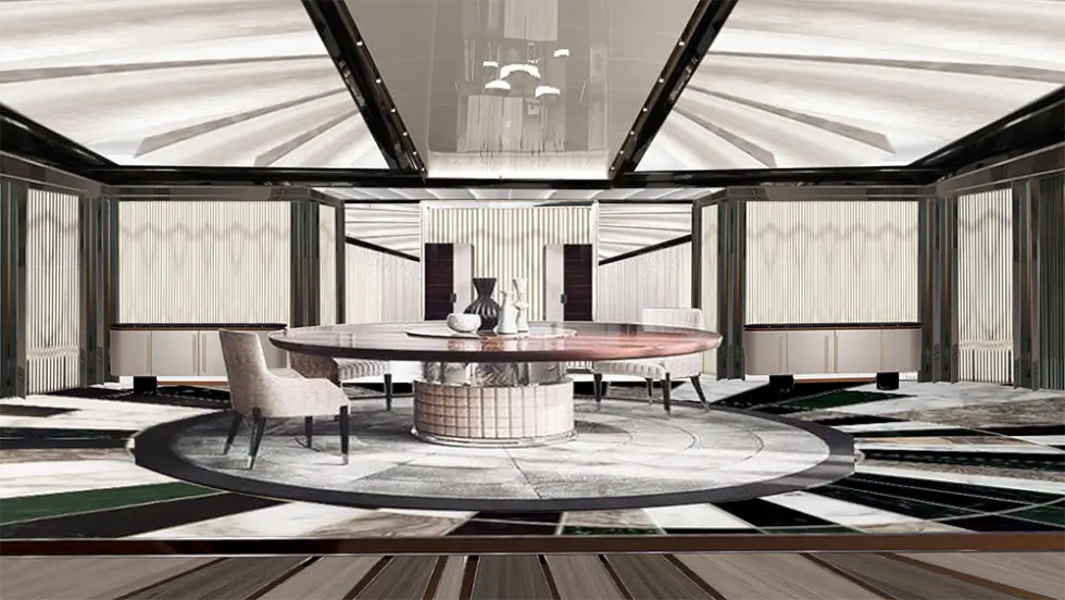 From afar, this 289-foot leisure vessel may seem like your average modern silhouette. The sleek aerodynamic form and clean lines from tip to tail do not really strike us as unique. However, upon closer inspection, the ship is brimming with distinctive details that showcase the artistic influences lifted from a bygone era.