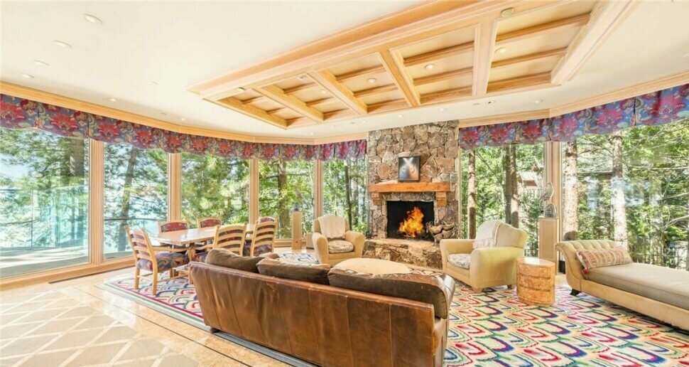 The property features a single-family home and a separate guest house. The wood and stone-clad main residence boasts 12,661 square feet of living space marked by a vaulted great room, glazing overlooking the lake, and a wet bar. There’s also a family room with a floor-to-ceiling fireplace, a formal dining room and a gourmet kitchen equipped with stainless appliances, eat-in island, and a butler’s pantry.
