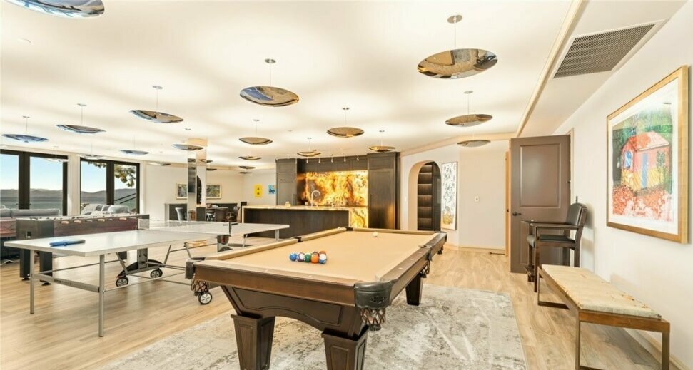 The Old Forge hosts four bedrooms with a luxurious primary suite with en-suite bedrooms and closets and a terrace with a hot tub. Three more bedrooms are in the 1,536-square-foot guesthouse. Other offerings in this lavish estate include a wellness/massage room, gym, a movie theater, a game room with partial kitchen, and a wine room.