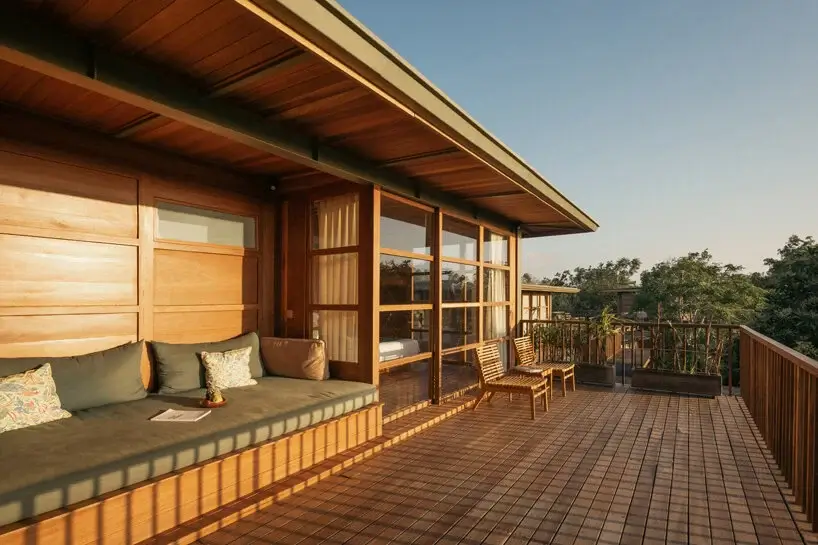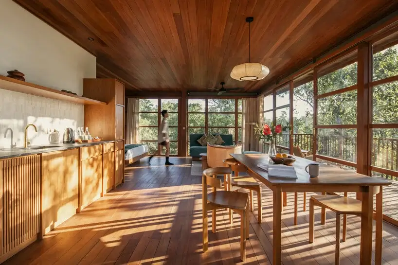 As for the layout, the Treehouse Villa stand on stilts and a wooden staircase on the side takes guests to a 64 square-meter open-plan layout on the ground floor that hosts the living, dining, and kitchen spaces. This area ensures a seamless indoor and outdoor flow to maximize natural lighting and ventilation. Stilt Studios also included pieces of wood furniture to contribute to the villa’s aesthetics and enhance its welcoming and cozy atmosphere.