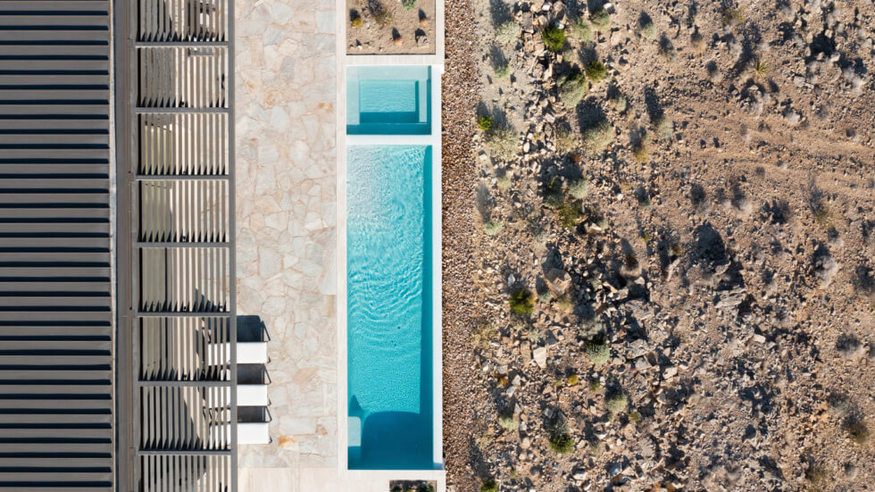 The five-bedroom house consists of two heavy, sand-colored stone walls that divide the plan into three volumes, each designed with a focus on comfort, ambiance, and efficiency. It consists of a primary suite, a second suite, and three extra bedrooms. It also has an open-plan communal living and dining area that connects to more private spaces including the bedrooms and servicing areas.