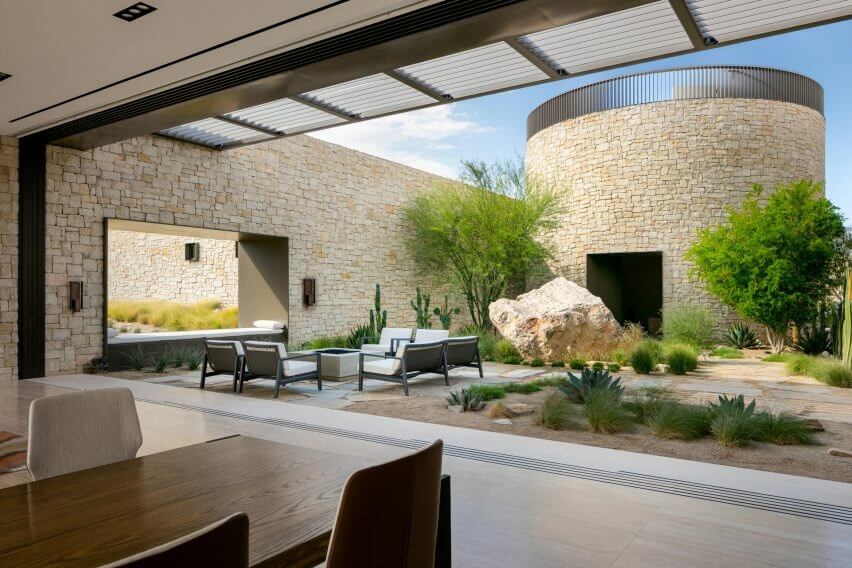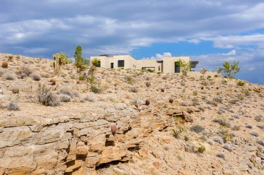 Local studio Daniel Joseph Chenin designed Fort 137 Residence to be modern and inviting while still seamlessly blending with its rugged desert setting in Las Vegas, Nevada. His team placed the sprawling stone residence around an 1850s fort-inspired rotunda, on a rock outcrop overlooking Red Rock Canyon.