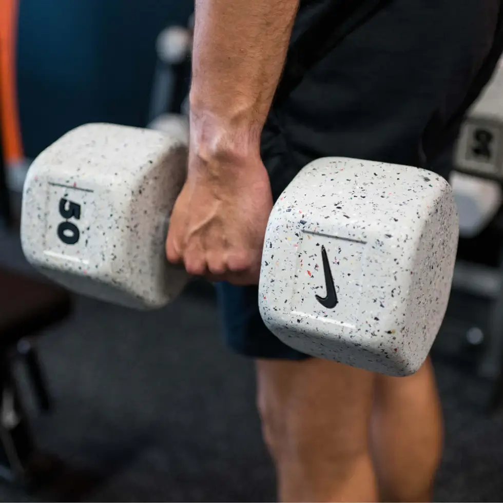 Elsewhere, the strategic placement of knurling on the ergonomic handles makes them easy to grip and control. Nike is using chrome-plated steel for superior corrosion resistance. Each Grind Dumbbell is adorned with the iconic Swoosh logo and its corresponding weight. So far, these are only available in a speckled gray colorway.