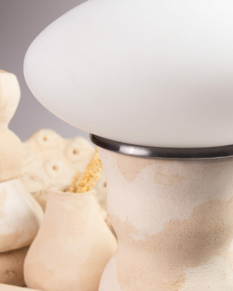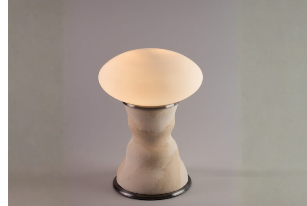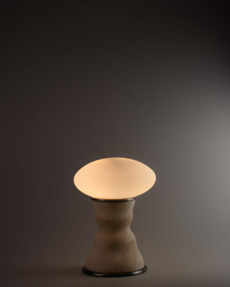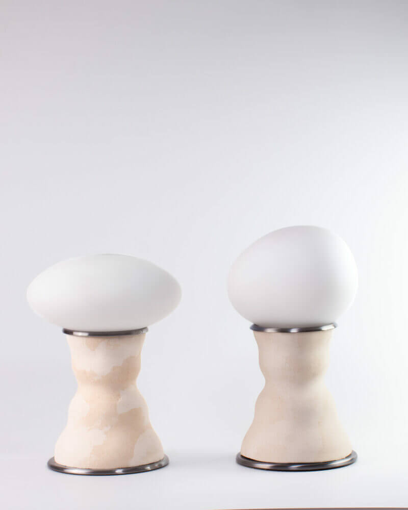 The Eggshell lamp looks and feels raw, featuring visible pores and a surface that attracts light as much as it gives off light. “Rather than fully controlling the outcome, we work with the material’s own reactions, allowing shifts in color, texture, and form to emerge. So in our case, form follows material. This allows us to understand the material and explore to achieve bespoke products.”