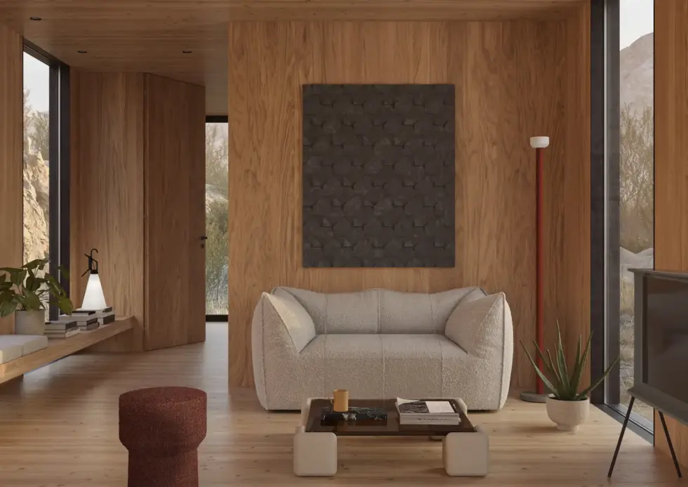 Architects Francesca Morsiani and Mujgan Merve Rinaldi presented a rectangular volume clad in wood panels for the exterior and repeated this natural palette inside the house using simple wood panels on the walls and the floors for a cohesive dwelling. Floor-to-ceiling windows interspersed the vertical panels for a sleek and elegant facade.