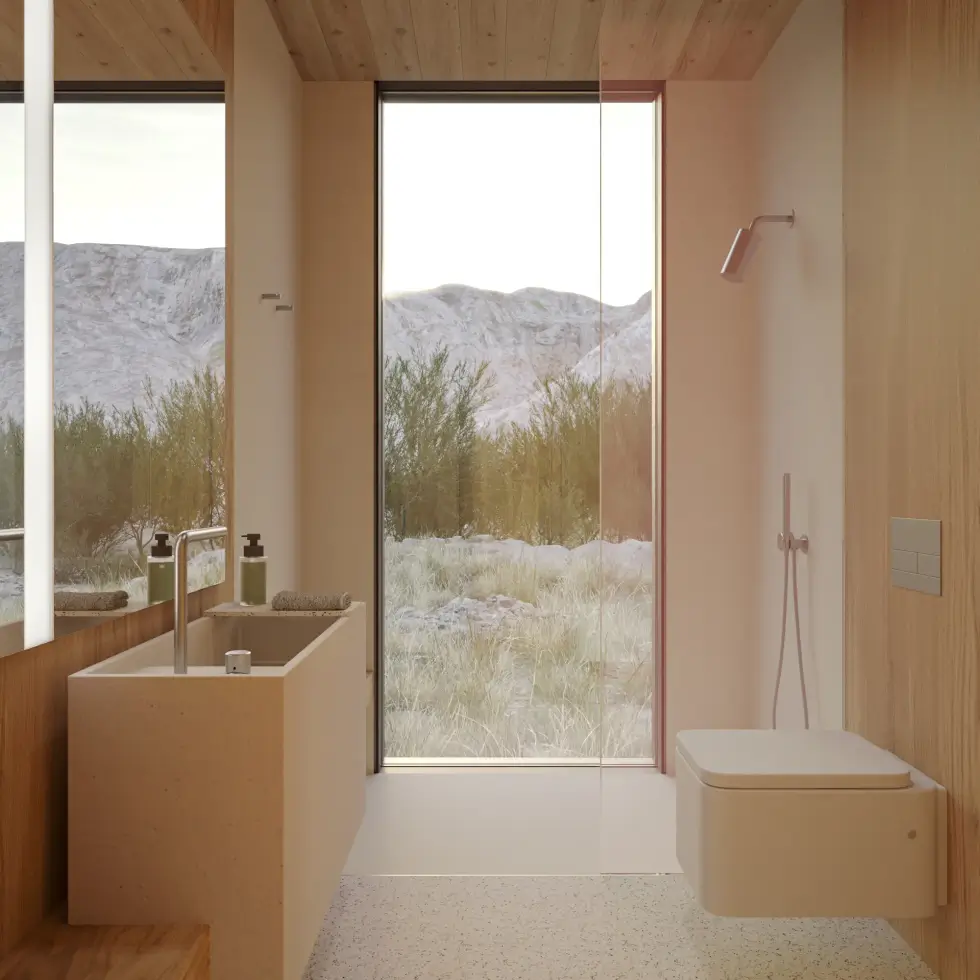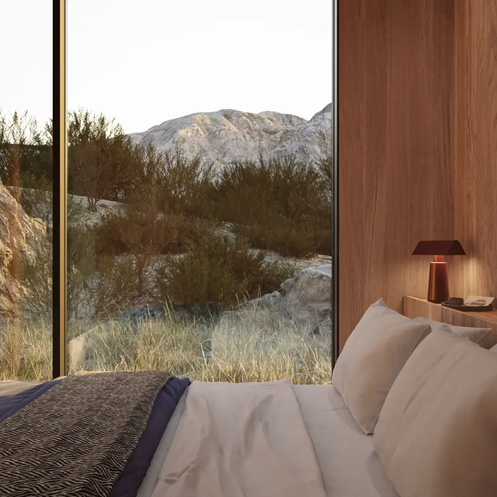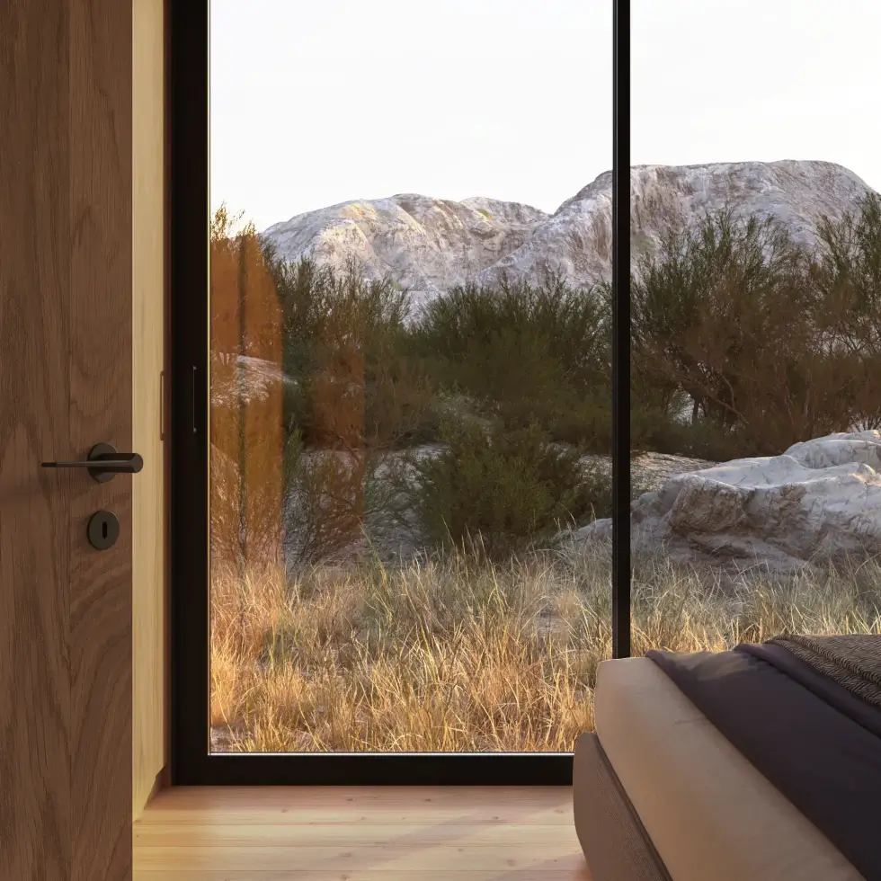 Likewise, despite the limited interior space, the studio ensured La Mini still feels open by having sight lines to the outdoors from most angles through the glazed walls. The bedroom is mostly clad in glass walls and even the bathroom overlooks the rocky landscape.