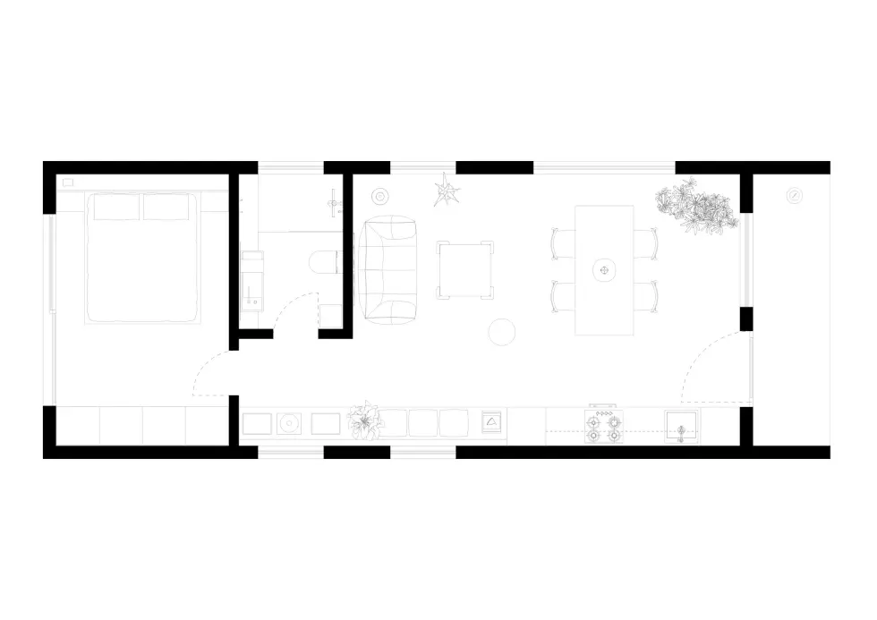 La Mini also boasts clever utilization of the limited space by using pared-down but fully-functional space-saving elements and furnishings. This includes the built-in bench at the entrance of the bedroom that also serves to hold objects. The LDK shares an open-plan layout with built-in kitchen cabinets running along one wall. Adjacent to the dining space are glass doors that lead out to a small deck.