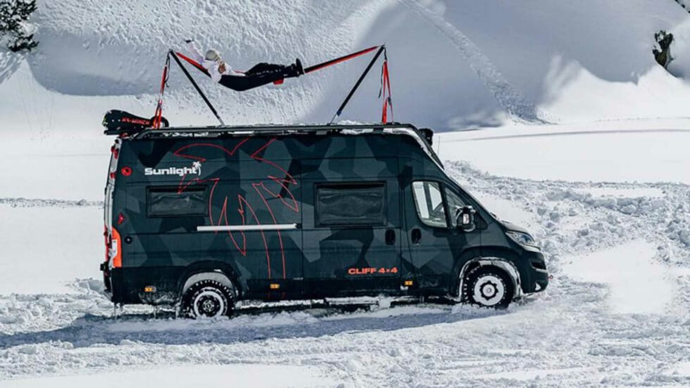 The SUNLIGHT CLIFF 4×4 Adventure Van has extreme sports written all over it. Cool little details like the climbing holds at the rear instead of a ladder, a non-slip GRP roof, and a roof winch at the rear end. The latter, along with telescoping poles allow you to put up a hammock which is perfect for a relaxing nap.