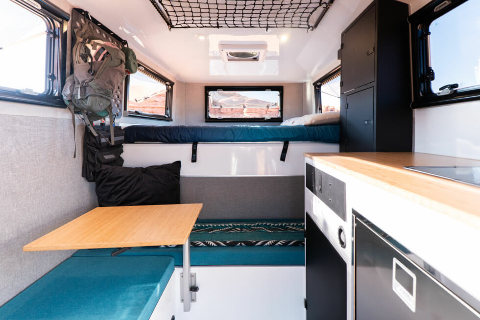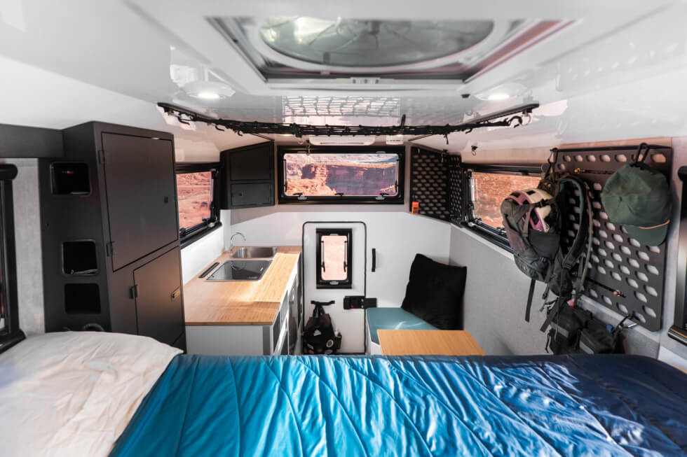 No need for a full conversion as it intuitively relies on a slide-in platform. The Flagship HT boasts several underpinnings that clients would usually find in full-size recreational vehicles. For durability and all-season readiness, the camper boasts a carbon fiber composite construction with a 1.5″ vacuum sealed insulation foam material in between.