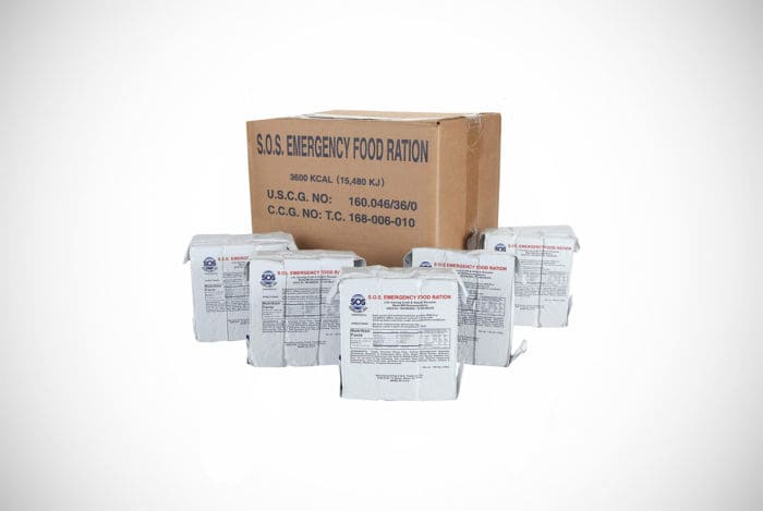 US Coast Guard approved, the 3-day supply of food and water has a shelf-life of five years and will do enough to keep hunger and thirst away for a good few days. The water comes in six packs which suggest that two a day should be enough while the food comes in one large slab that can be broken into nine pieces (3 per day).