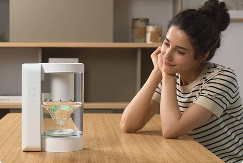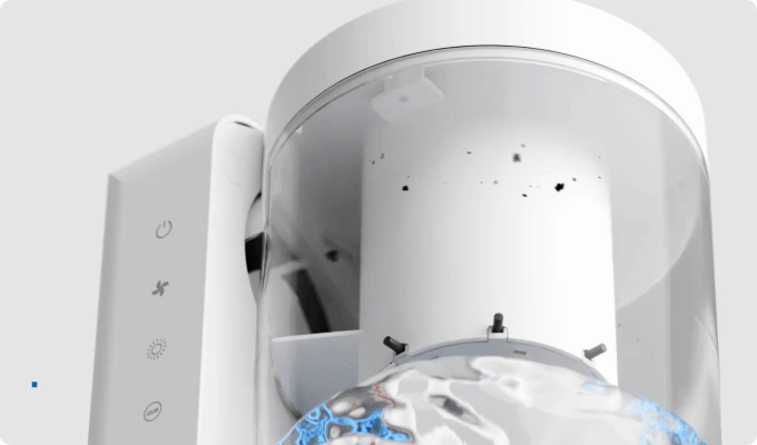 Despite its small size, this filter-free air purifier features double vortex technology and electrostatic precipitation. The latter traps ultrafine dust to everyday particles using carbon fiber electrodes that release electricity into the air to energize fine dust particles. These charged particles become easily drawn to the swirling water surface that acts like a sweeping dust collector.