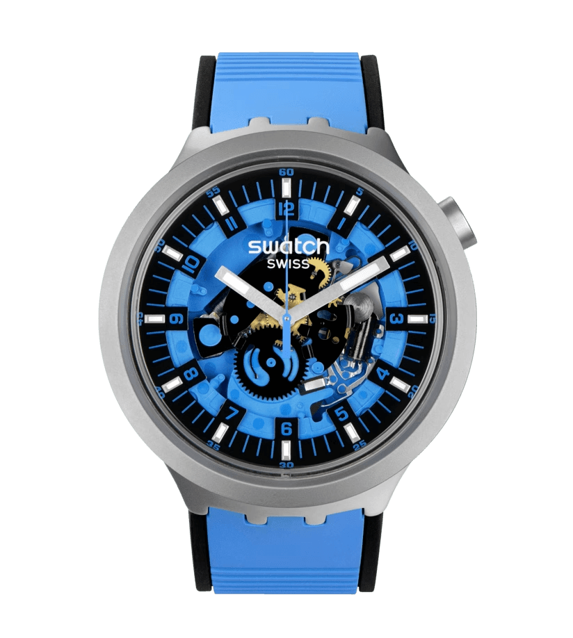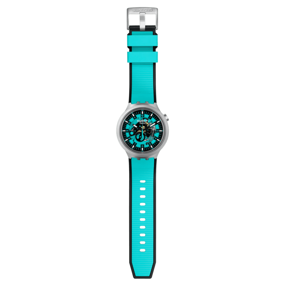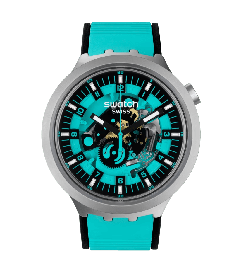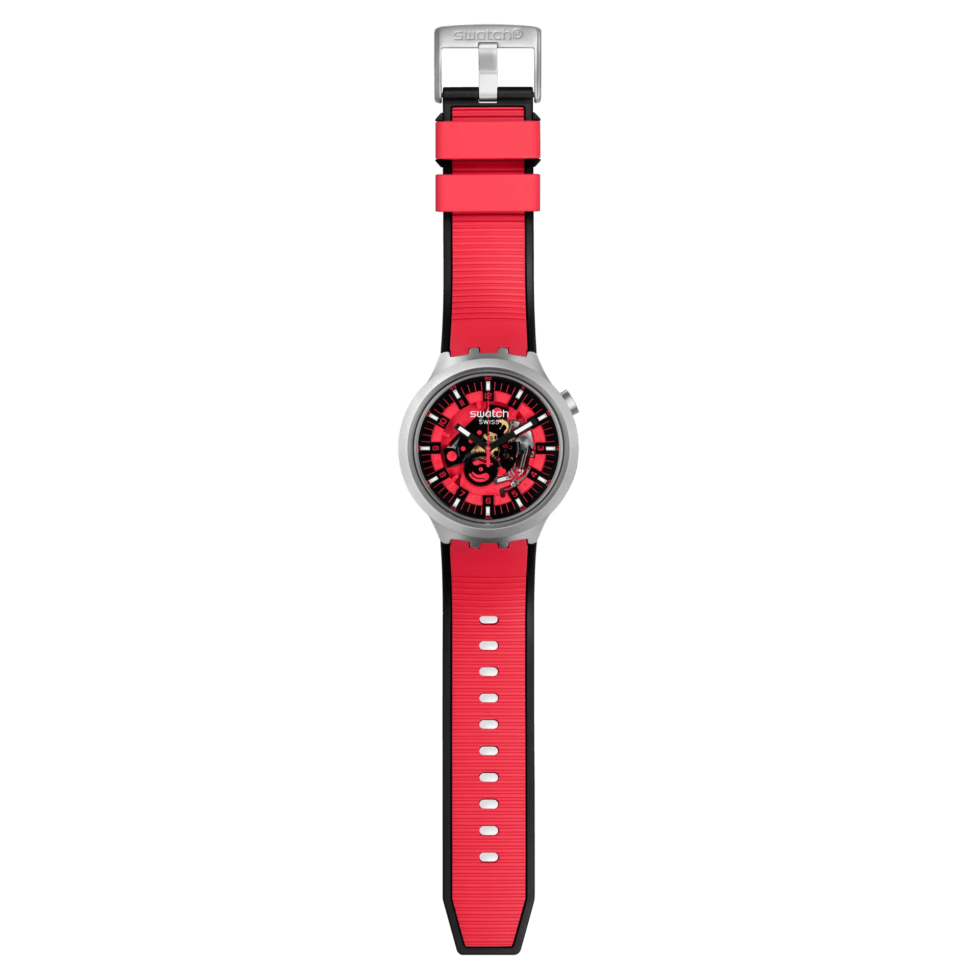The minute track’s indices, Arabic numeral hour/minute markers, and the seconds hand are all in a matching shade as the rubber strap. Swatch describes the BIG BOLD IRONY collection it as “A BIG BOLD first that boldly goes where no watch has gone before.”