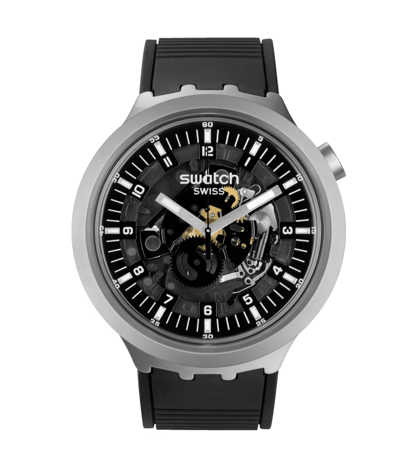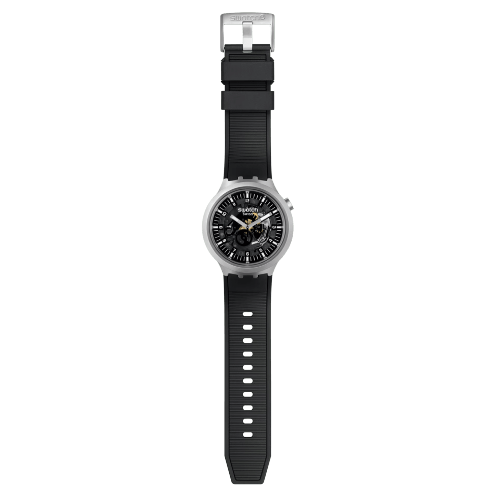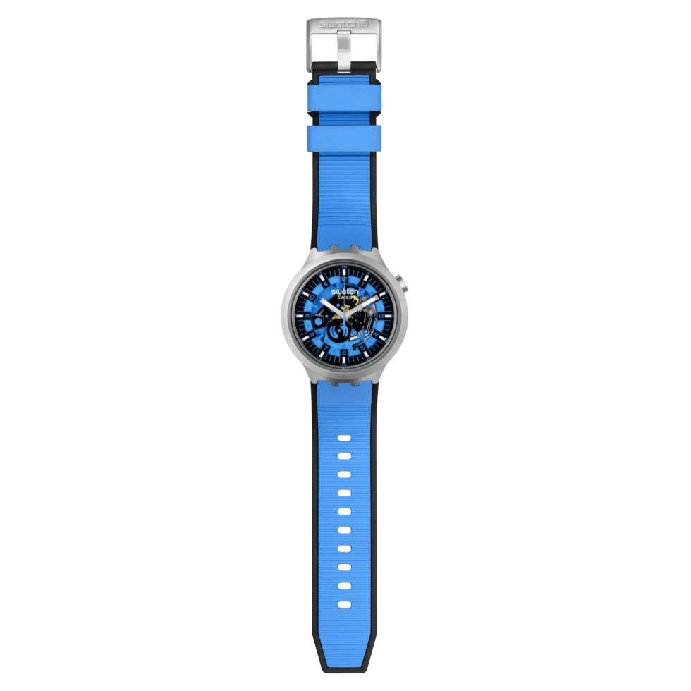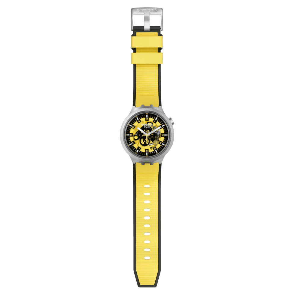 The minute track’s indices, Arabic numeral hour/minute markers, and the seconds hand are all in a matching shade as the rubber strap. Swatch describes the BIG BOLD IRONY collection it as “A BIG BOLD first that boldly goes where no watch has gone before.”