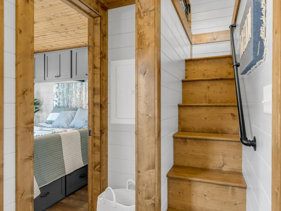 There’s one fully enclosed bedroom for privacy and a loft type. The bathroom can fit either a shower or a tub/shower combo, has a flushing toilet, and a vanity. Mesa serves as a modern retreat but needs special permit to tow because ot its size.