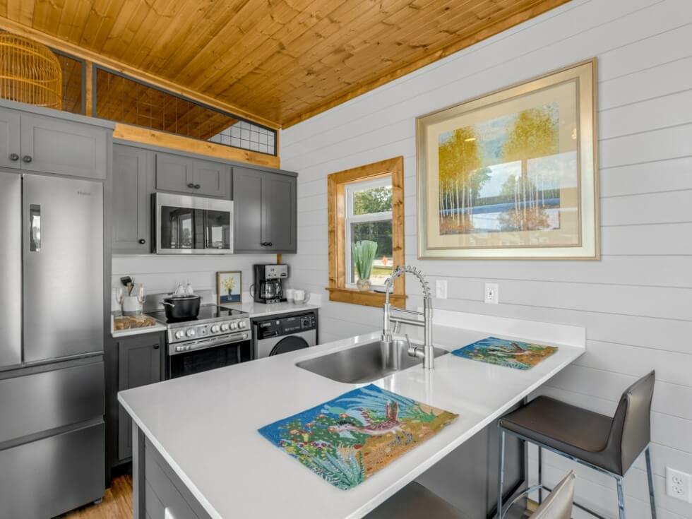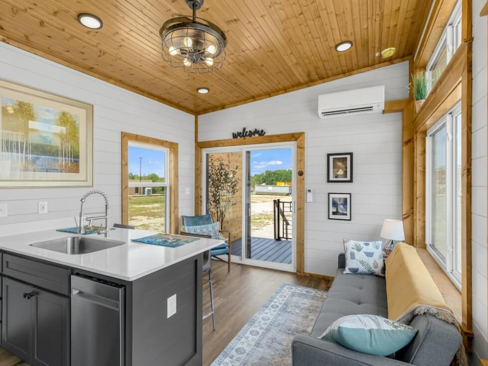 Meanwhile, inside is an open-plan two-bedroom layout with a living room that is spacious enough for a full-size sofa. It connects directly to the rear deck via sliding glass doors. The kitchen is a few steps away from the living area and boasts modern full-size appliances and a generous prep room.