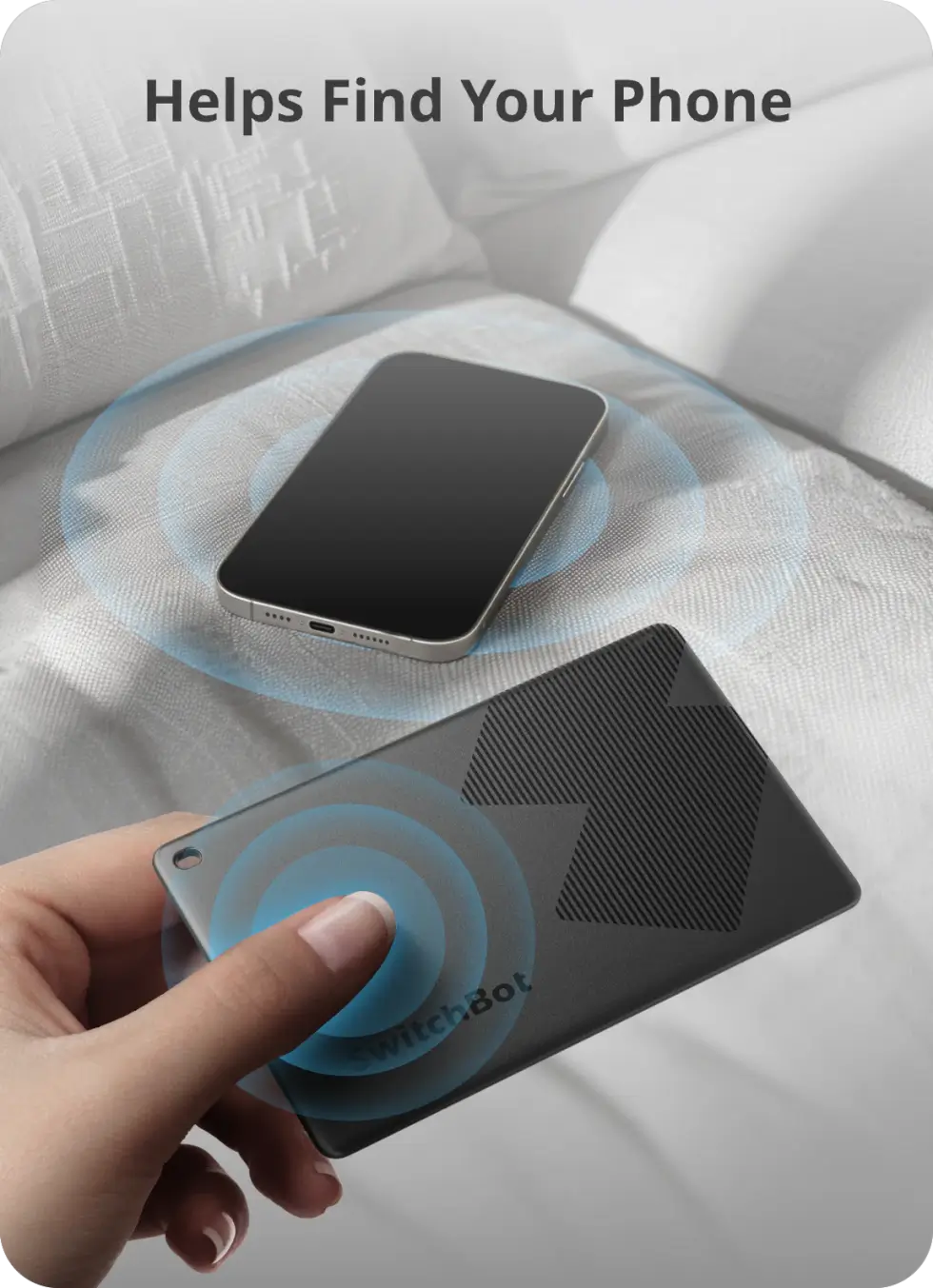 SwitchBot’s Wallet Finder Card works with Apple’s Find My network for precise global positioning. It emits a sound for easier location tracking and notifies your phone when tracked items leave your local vicinity. Double click on the button to activate the sound even when it’s on silent mode. You can even share device locations with your friends or family to keep them connected or updated.