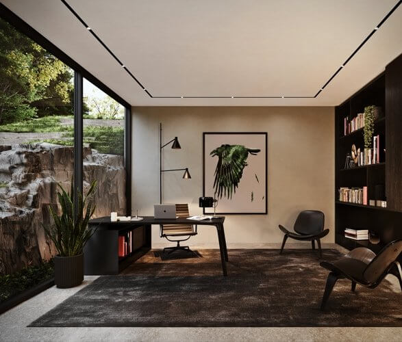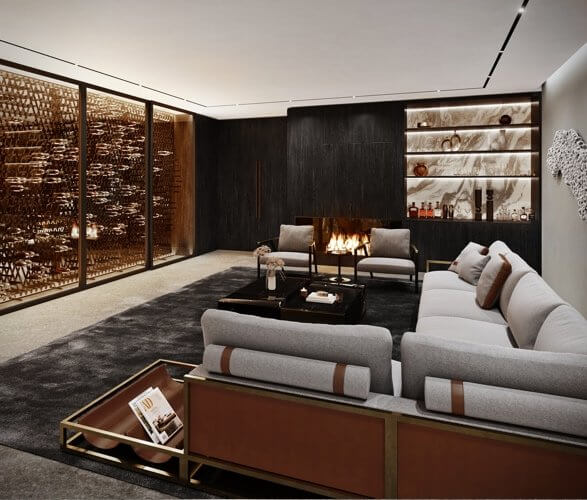 Aston Martin designed the estate with a focus on sustainability. The structure utilized organic building materials. It has solar and battery systems. It also thrives on the use of green building, geothermal heating + cooling, and radiant floor heating.