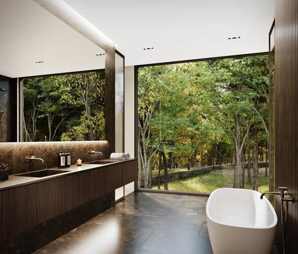 The Sylvan Rock House sits on a lush, 55-acre estate in New York’s rustic Hudson Valley. It is the first private residential property designed by British luxury car manufacturer Aston Martin.