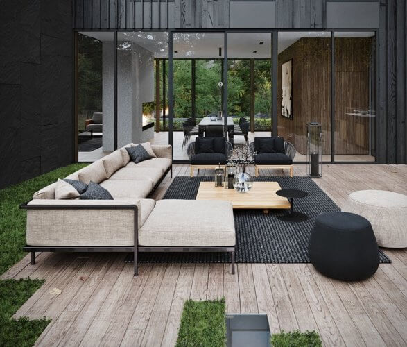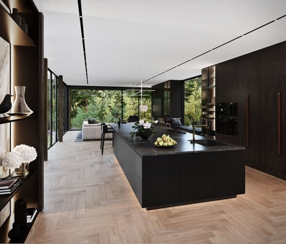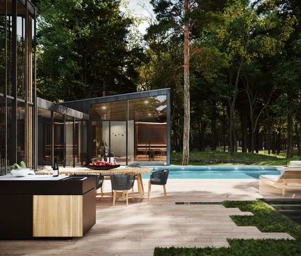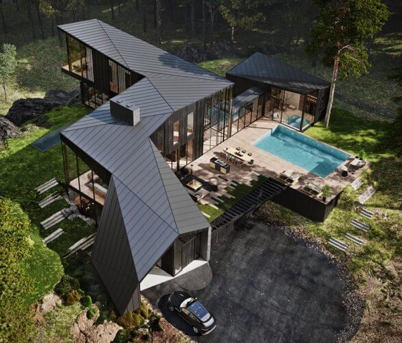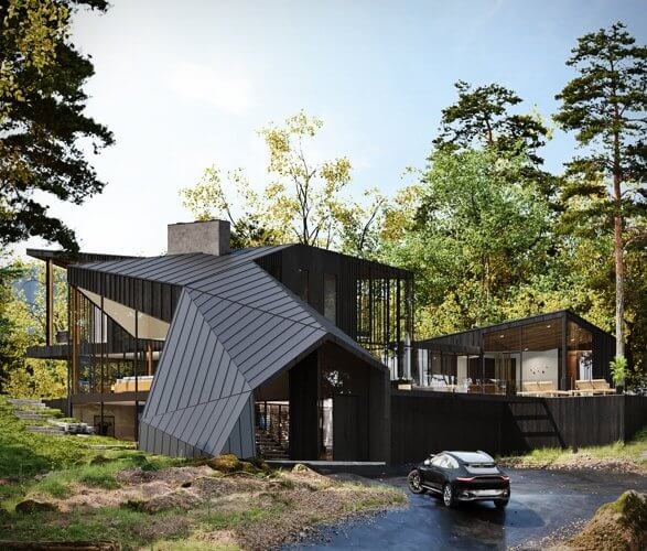 The house boasts elegance in all its 360-degree angles from the roof, paneled walls to the floor-to-ceiling windows. It hosts a family-sized swimming pool on the deck and an outdoor kitchen and lounging area. The estate is impressive both on the inside and outside and its architectural form corresponds to the rocky ledge it sits on.