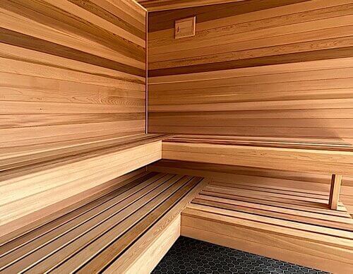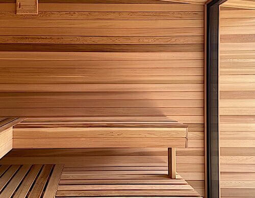 Speaking of the interior, this prefab sauna features a two-level bench system, much like those you see in spas. It can accommodate six adults and keeps everyone cozy in any climate using a Tylo Sense Pure 8 heating system.