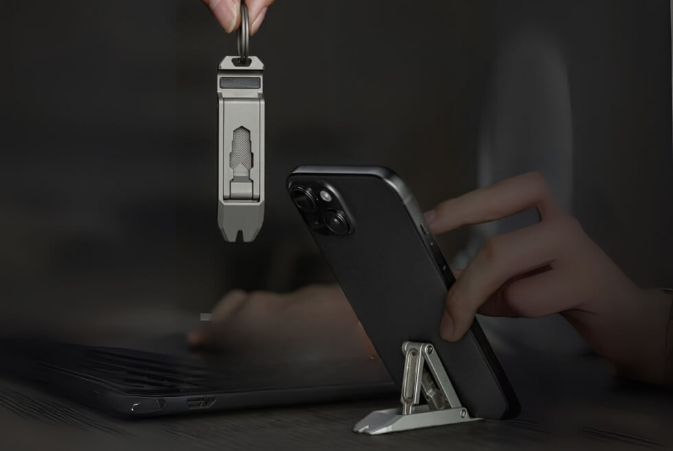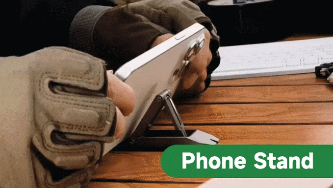 This folding phone stand boasts a durable and waterproof construction made from aerospace-grade 5 titanium for lightweight strength and corrosion resistance. It weighs just 36.8g but amazingly has a load capacity of 2kg. Its three-fold mechanism offers three sturdy viewing angles ( 30°, 45°, and 60°) that support both landscape or portrait modes with a fold-n-click security. Anti-slip pads on the base ensures surface grip to hold the phone steady.