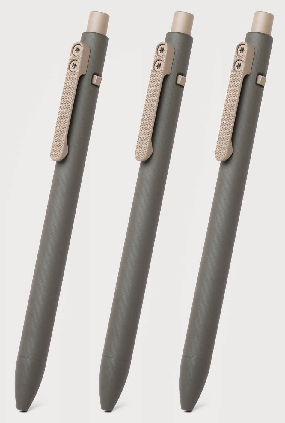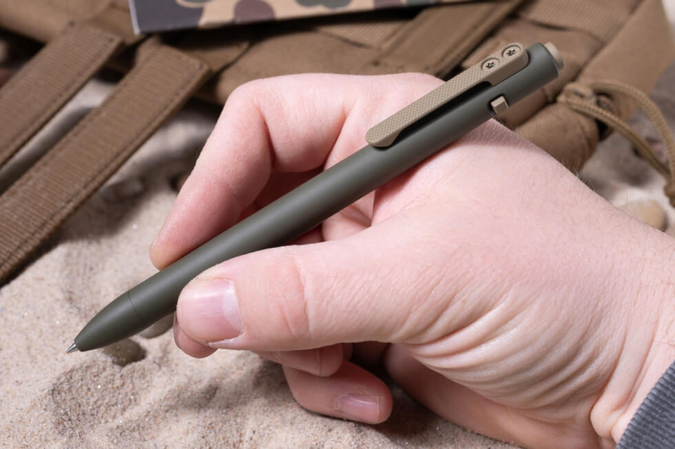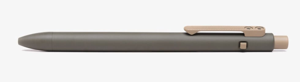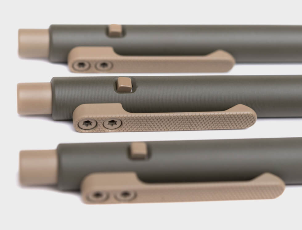 The Tactile Turn Overlander sports a Mil-Spec Olive Drab Green Ceratoke body painted with Coyote Tan accents. The matte Ceratoke application on the clip, nook, and release button makes the construction ultra-resilient. It makes the pen resistant to scratches, abrasions, and chemical and temperature exposures. Plus, using titanium for its body makes it super lightweight for everyday adventures.
