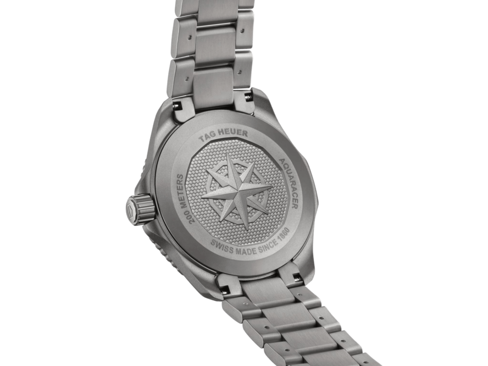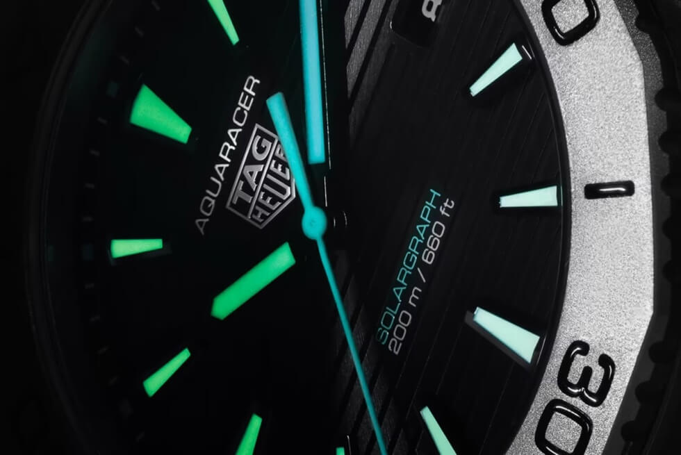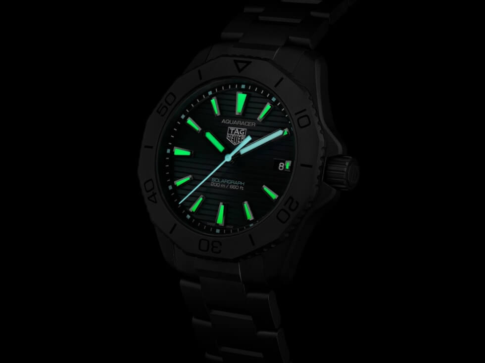 Applied hour markers frame the perimeter of the dial with a raised chapter ring that holds the minute track. Luminescent coating lines the spines of its indices and hands for reliable visibility in the dark. Then, there’s the date aperture at 3 o’clock. Also, the TAG Heuer Aquaracer Professional 200 Solargraph will ship out in February.