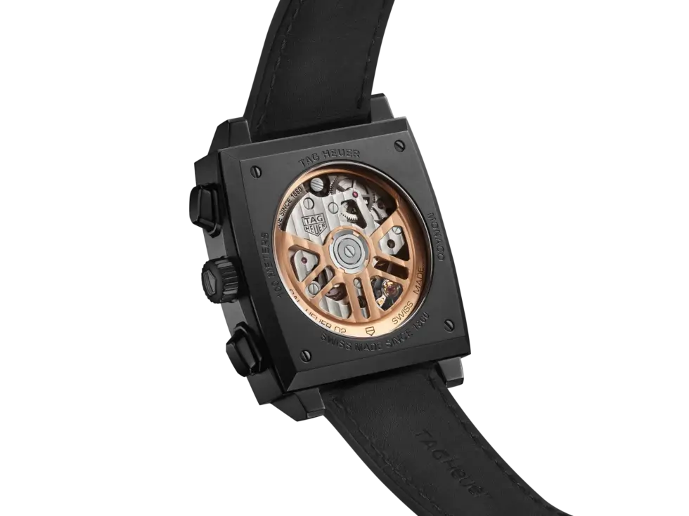 Two squarish sub-dials occupy the spaces at 3 o’clock or 9 o’clock. A quick peek inside via the exhibition case back window reveals a rotor also with 5N rose gold plating. The components of its Caliber HEUER02 self-winding chronograph movement are likewise visible. The Monaco Special Edition comes with a black alligator leather strap for an elegant ensemble for your wrist.