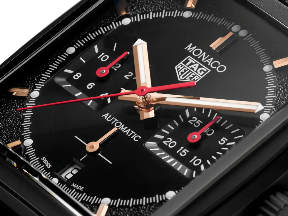 Next, there’s the almost gemlike sapphire crystal with the Monaco Special Edition’s beveled edges. Beneath is the almost completely Stygian dial if not for the white indices and other details. 5N Rose gold plating adorns the hands, hour markers, and one sub-dial hand at 6 o’clock just above the date window.