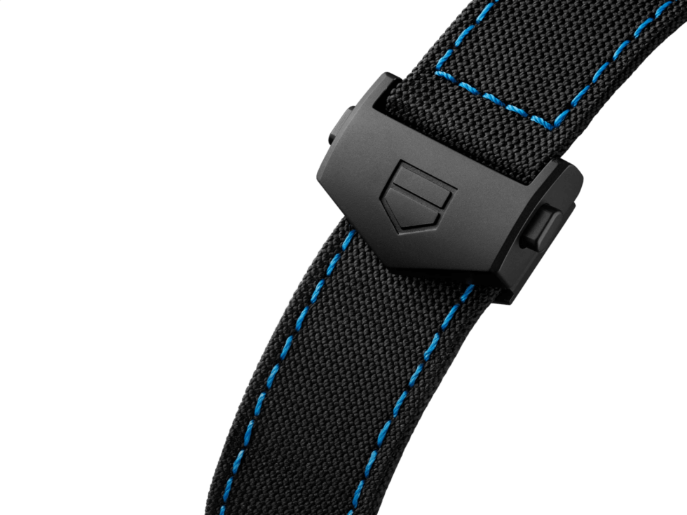 Meanwhile, the minute track is just a step below with blue baton hour markers. Sub-dials at 3 o’clock and 6 o’clock sport translucent blue sapphire discs. At 9 o’clock, the skeleton dial of the Monza Flyback Chronometer features a date aperture. It runs on a high-precision COSC-certified Caliber Heuer 02 Flyback automatic movement. TAG Heuer includes a black textile strap with blue stitching and a push-button folding clasp closure.