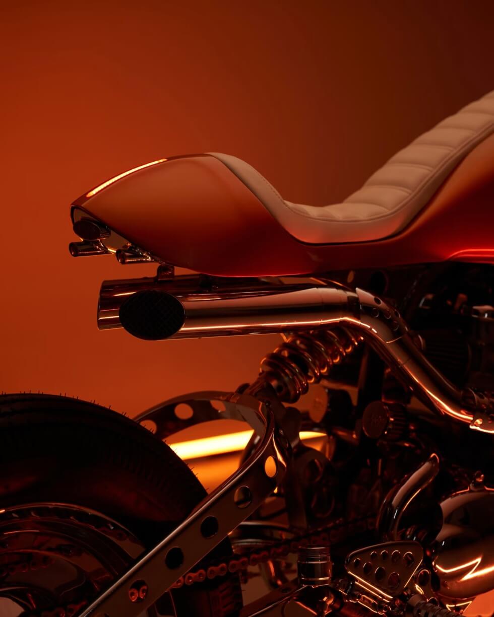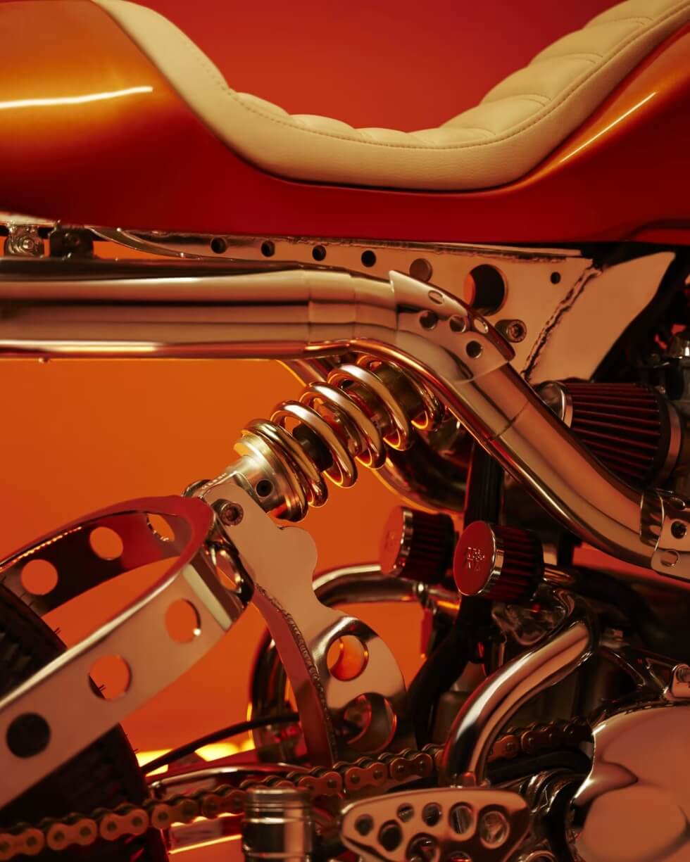 To truly embody the characteristics of the Sun god, its body receives multiple coats of paint. This process produces an orange hue closest to what they originally had in mind for the Helios. Meanwhile, a section of the front fairing housing its double headlights is sporting a shade of cream for contrast.