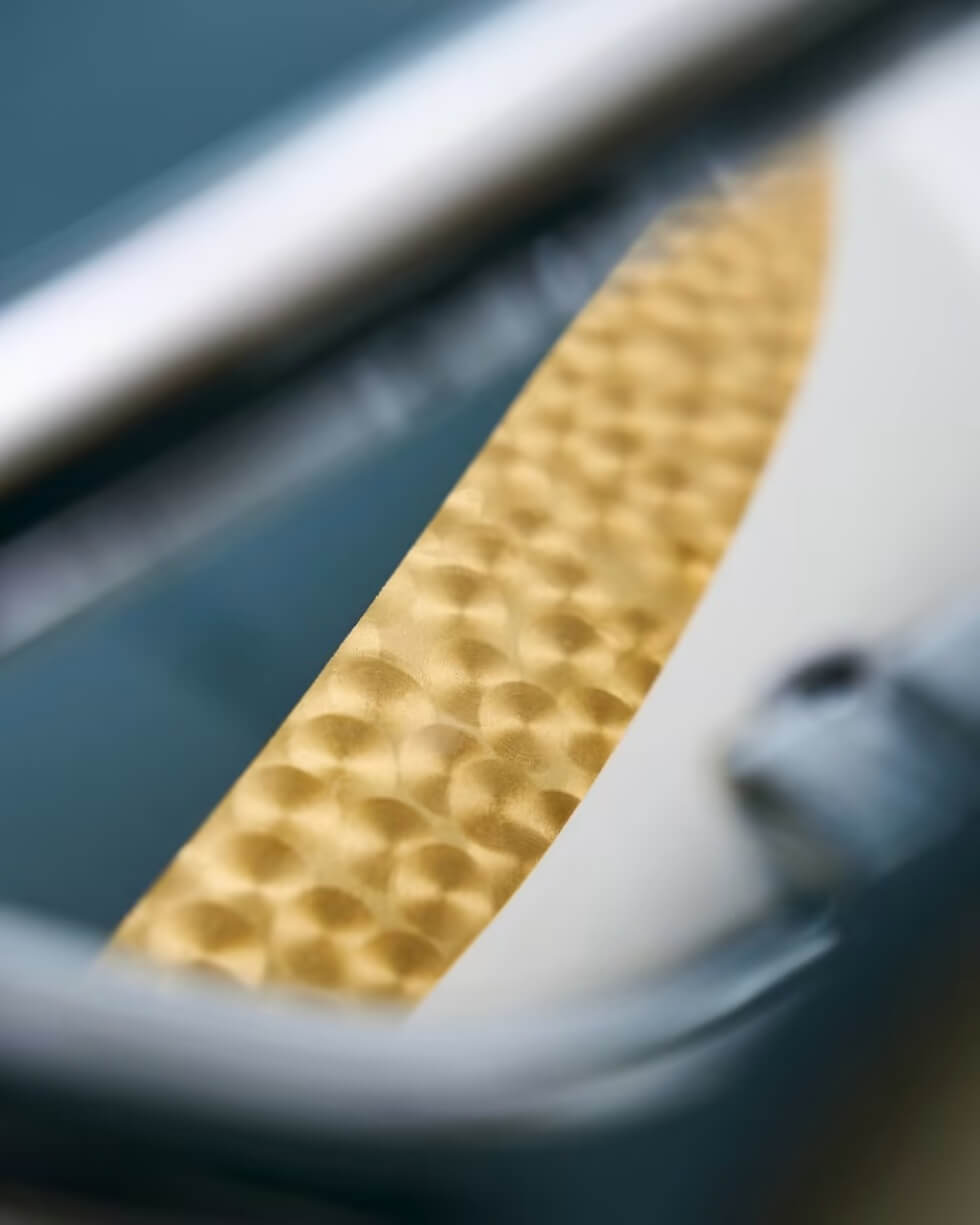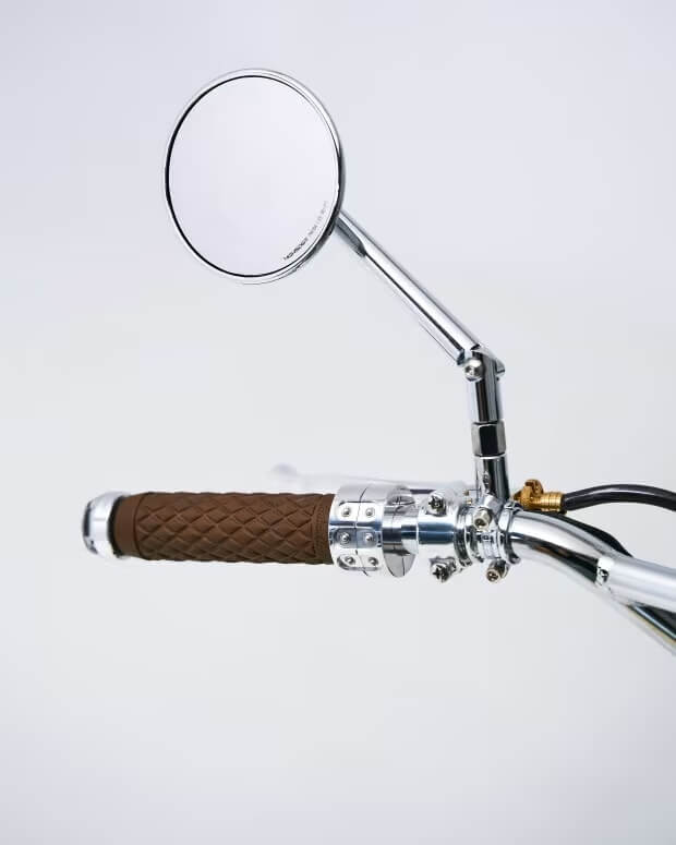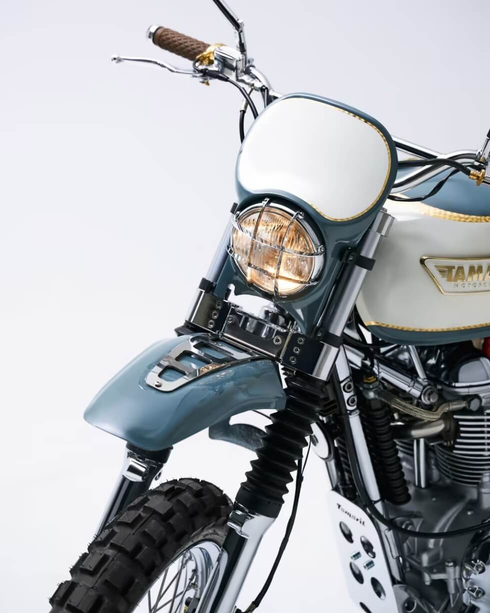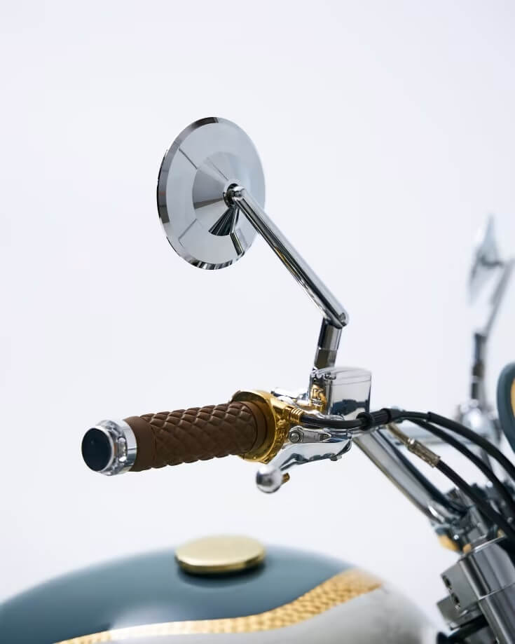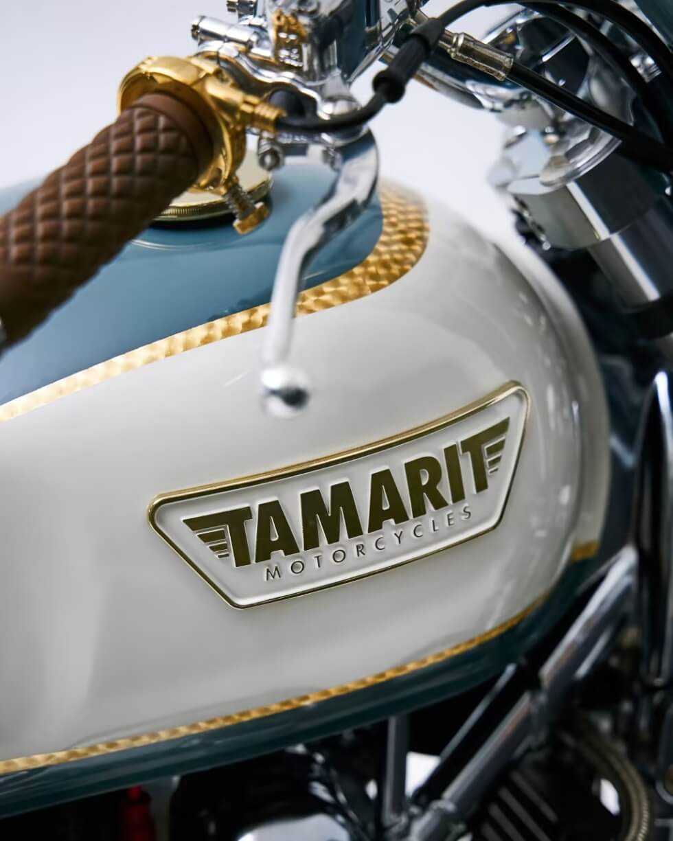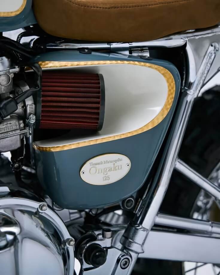 Its aesthetic elements begin with the chromatic combo of grayish blue, white, and glittering gold. We also have hints of brown from the custom saddle and the alluring glimmer of chrome, brass, and nickel on many parts of the Ongaku. Tamarit Motorcycles likewise reveals that the gold leaf that goes into this bike is meticulously done by hand.