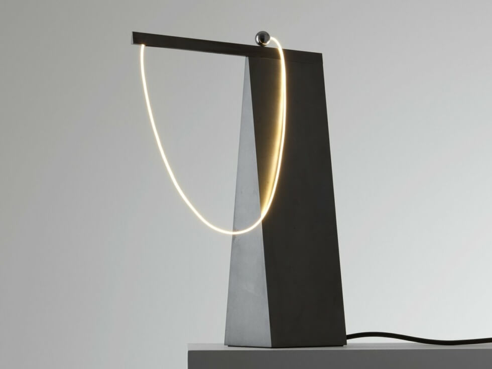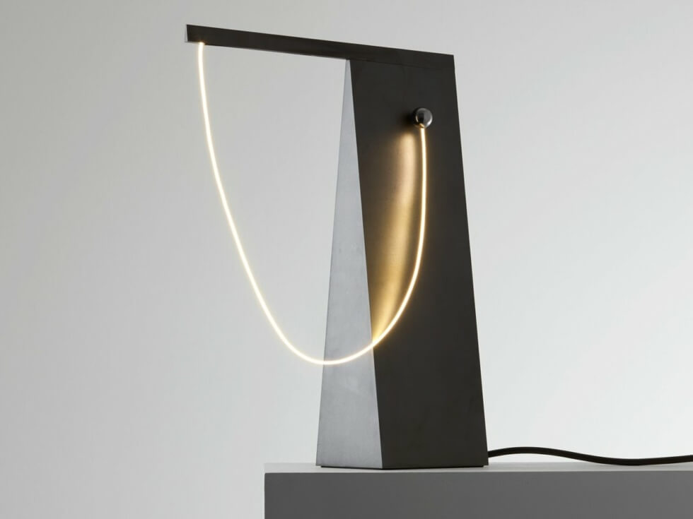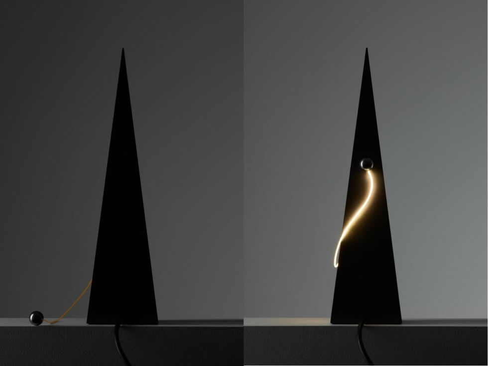 The Tangent Lamp is created  by RELVĀOKELLERMANN through their experimental RK Lab. Its mechanism questions  pre-conceived notions of how a lighting object is supposed to work. As RK Lab describes it, the object “investigates the relationship between experience, technology and the purpose of light itself.”