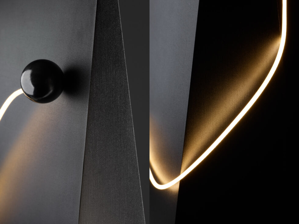 It all happens through the tangent, hence the lamp’s name. The user sets up the mood and transforms the lamp with every interaction. The magnetic sphere connects to any part of the steel block and the moment it detaches from this connection, the lamp powers off.