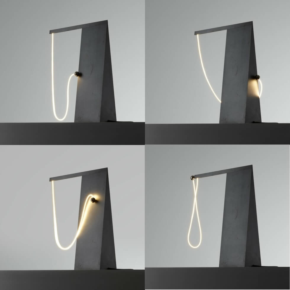 Its design turns the simple act of switching on a light into a moment of interactive play that changes the lamp’s posture and mood. It responds to human touch, making the user an active participant in shaping its silhouette.