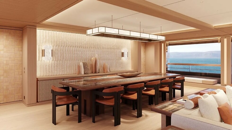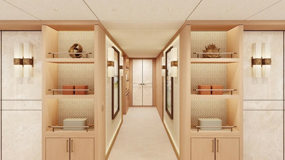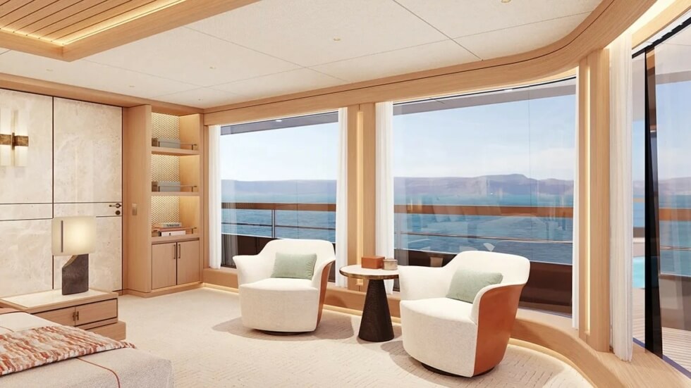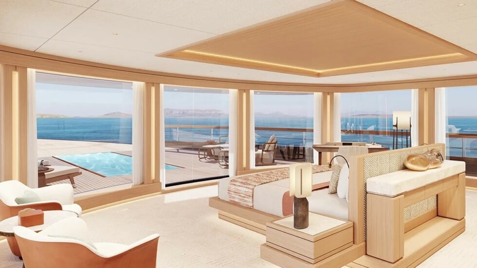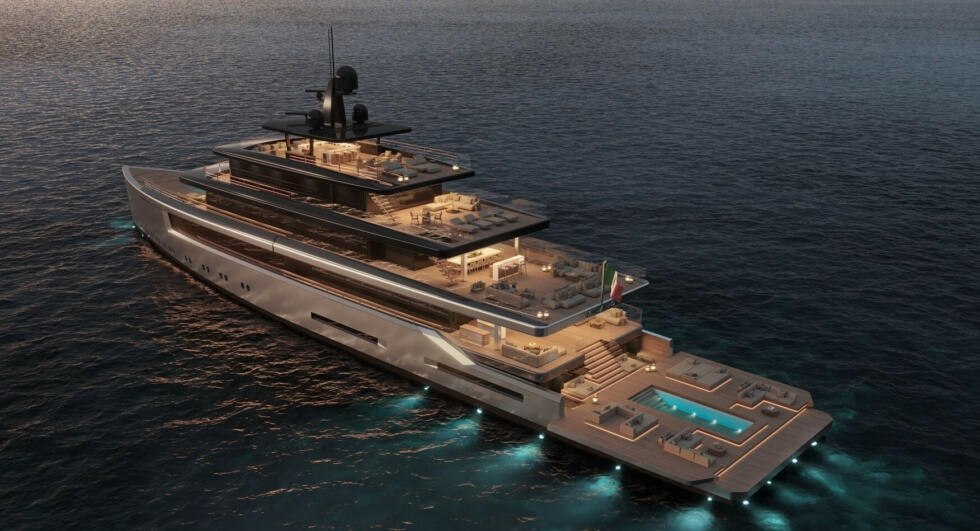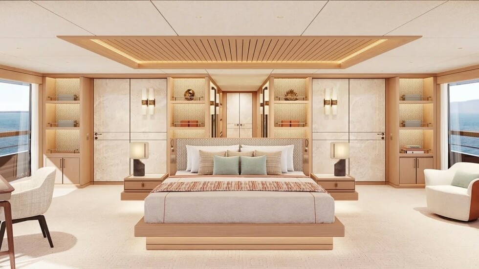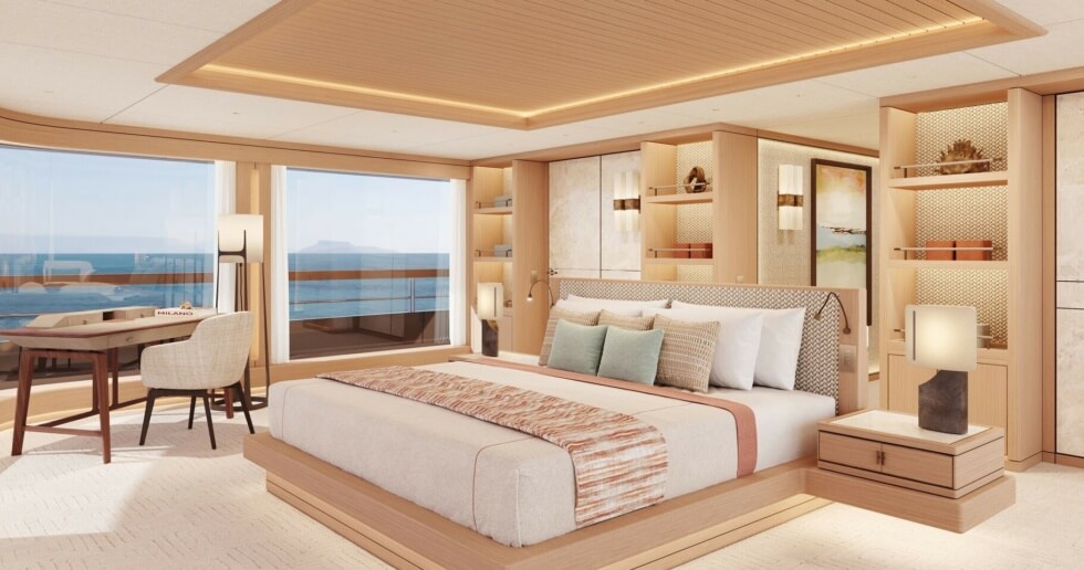 It features a walk-in closet, a study, two bathrooms, an outdoor dining area, and a sky lounge. The beach club at the stern is where you’ll find a swimming pool, fold-out terraces, a wellness room, a gym, and a lounge. Supplying the Milano with enough grunt to reach 16.5 knots are 1,650 kW e-motors powered by variable-speed CAT C32 generators.