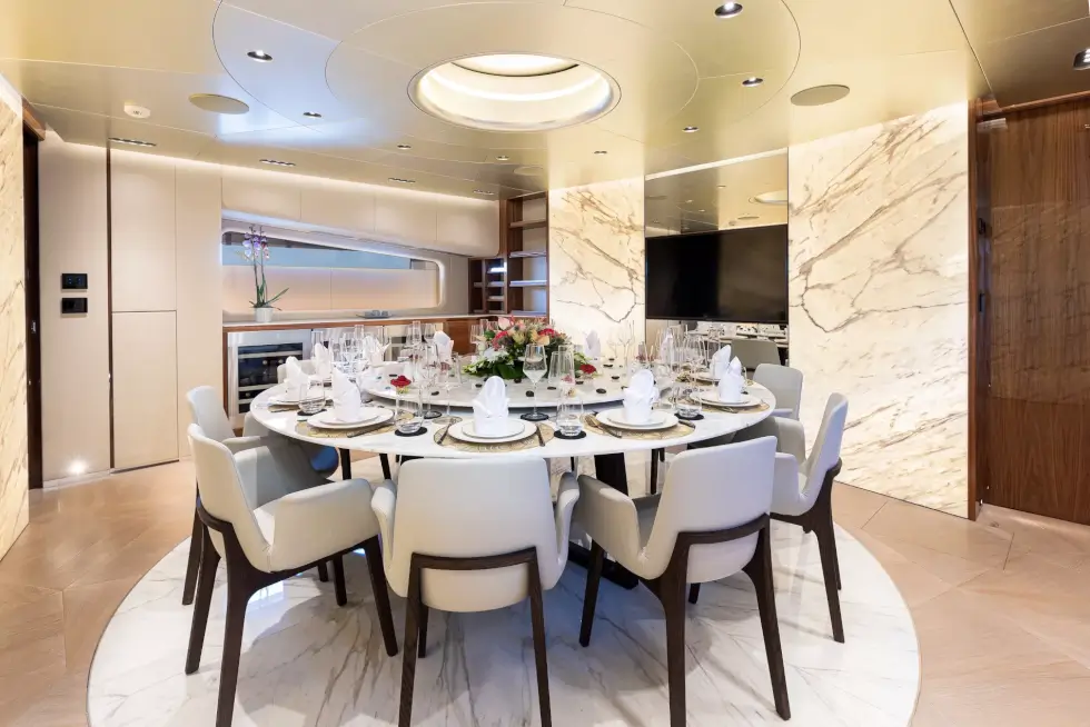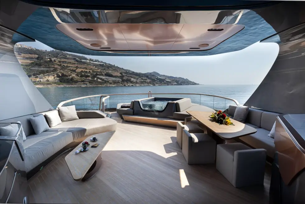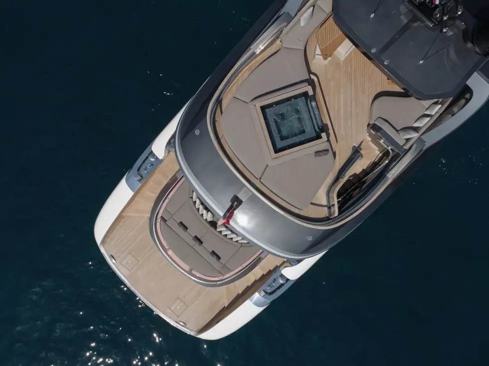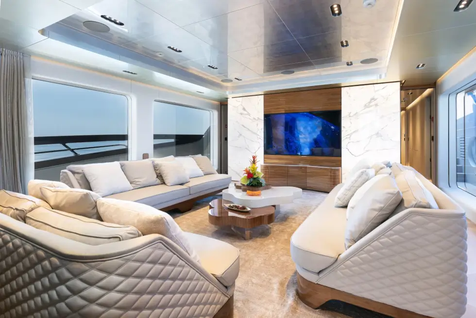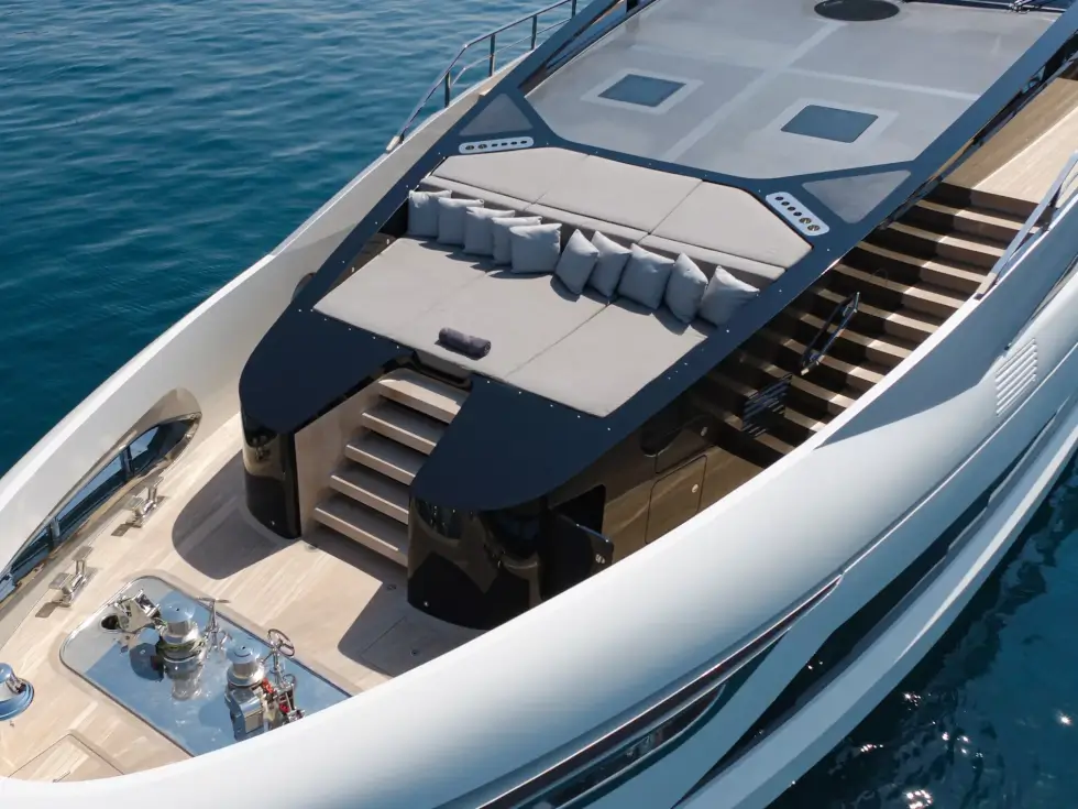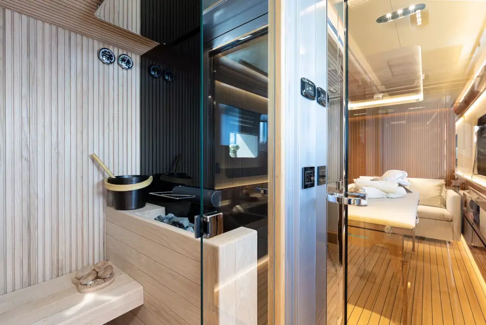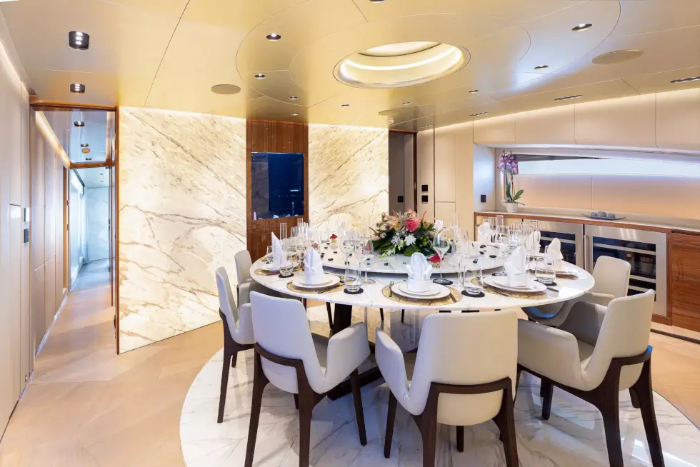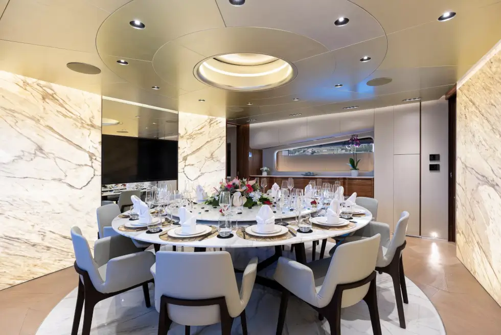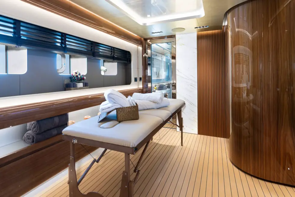 Meanwhile, the enclosed volume has a dining room, day heads, galley, laundry facilities, and the main saloon. The lower deck houses the engine room, a full-beam owner’s cabin, a guest cabin, a VIP cabin, the captain’s cabin, crew cabins, a massage room, and a garage at the rear.