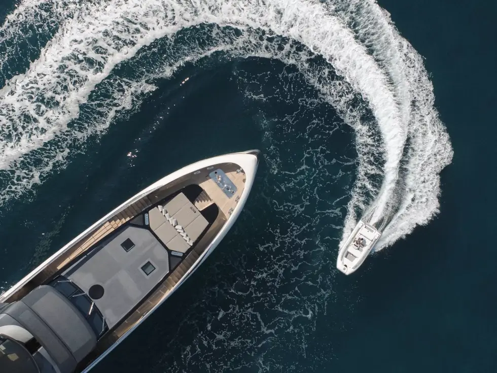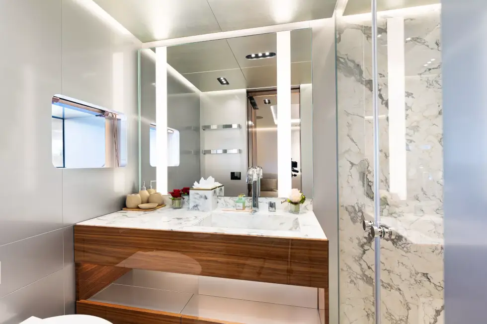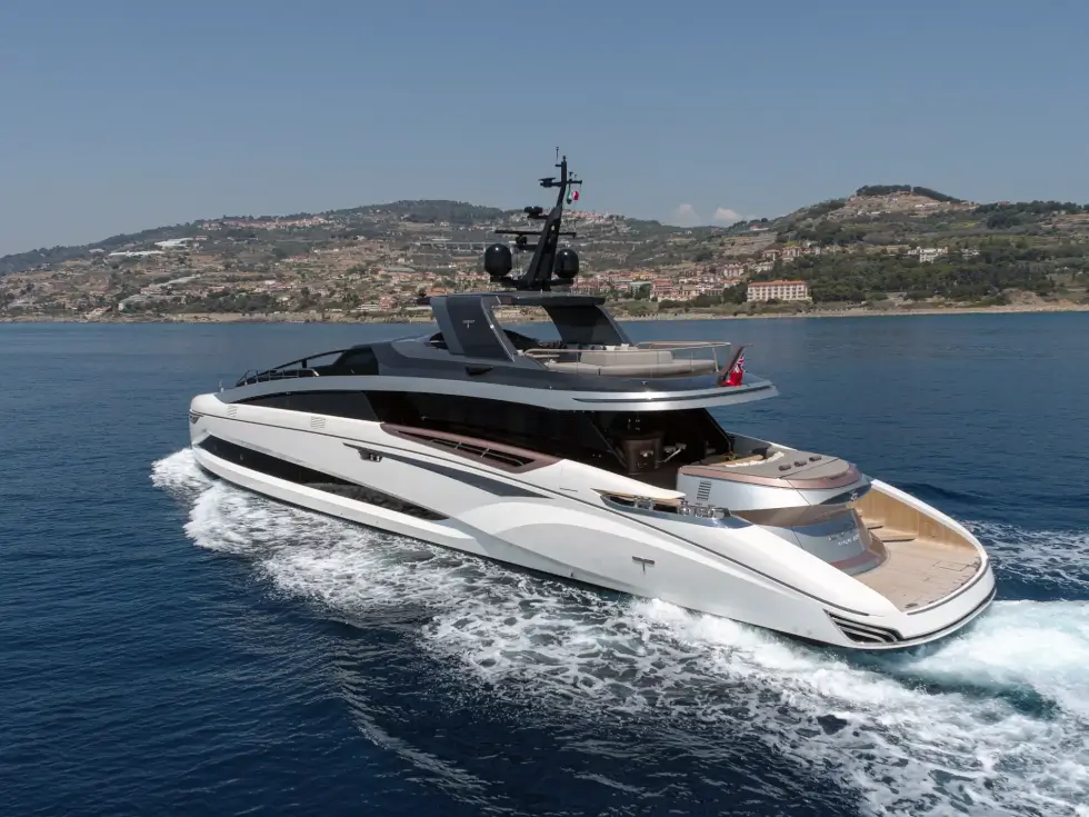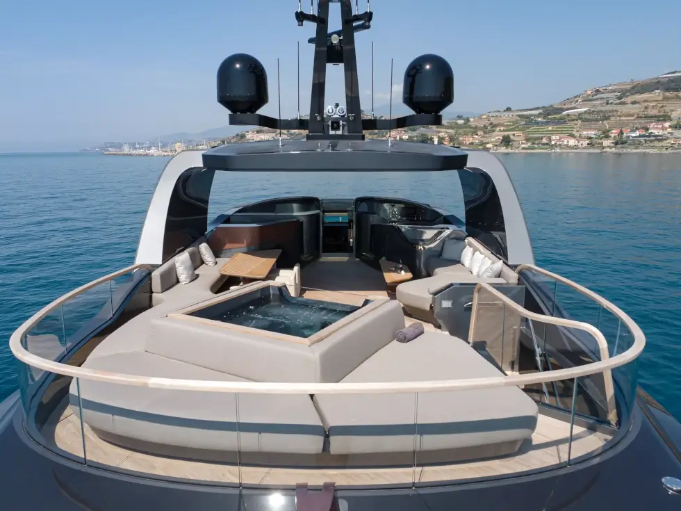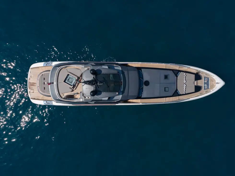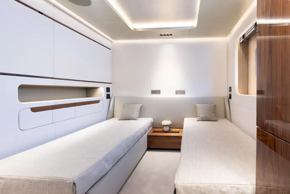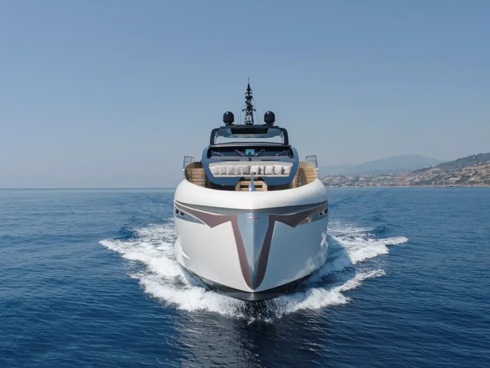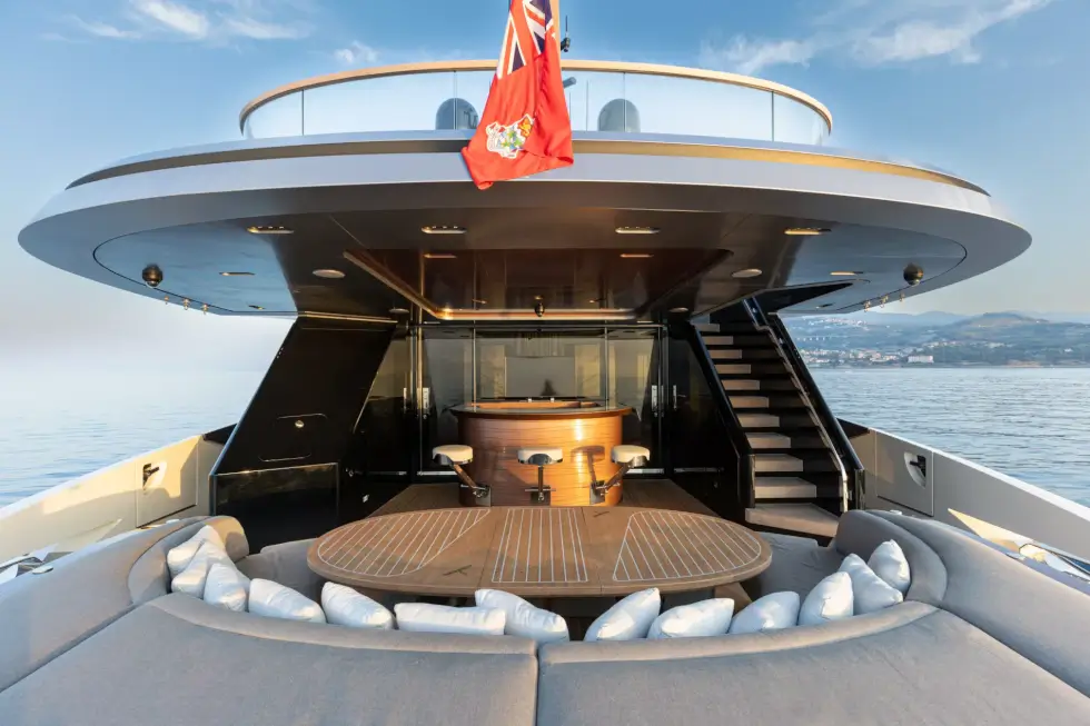 Meanwhile, the enclosed volume has a dining room, day heads, galley, laundry facilities, and the main saloon. The lower deck houses the engine room, a full-beam owner’s cabin, a guest cabin, a VIP cabin, the captain’s cabin, crew cabins, a massage room, and a garage at the rear.