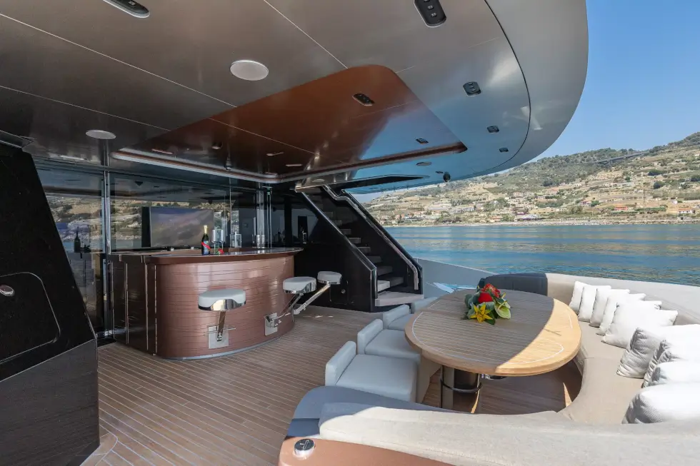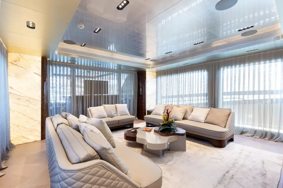 Starting with the flybridge, The Lucy packs a Jacuzzi surrounded by sun pads, a bar, seating, and two stairs. The forward has access to the wheelhouse, while the aft leads to the main deck lounge area. Here you’ll find a C-shaped seating, an oblong table, another bar, more sun pads up front, and stairs leading to the beach club.
